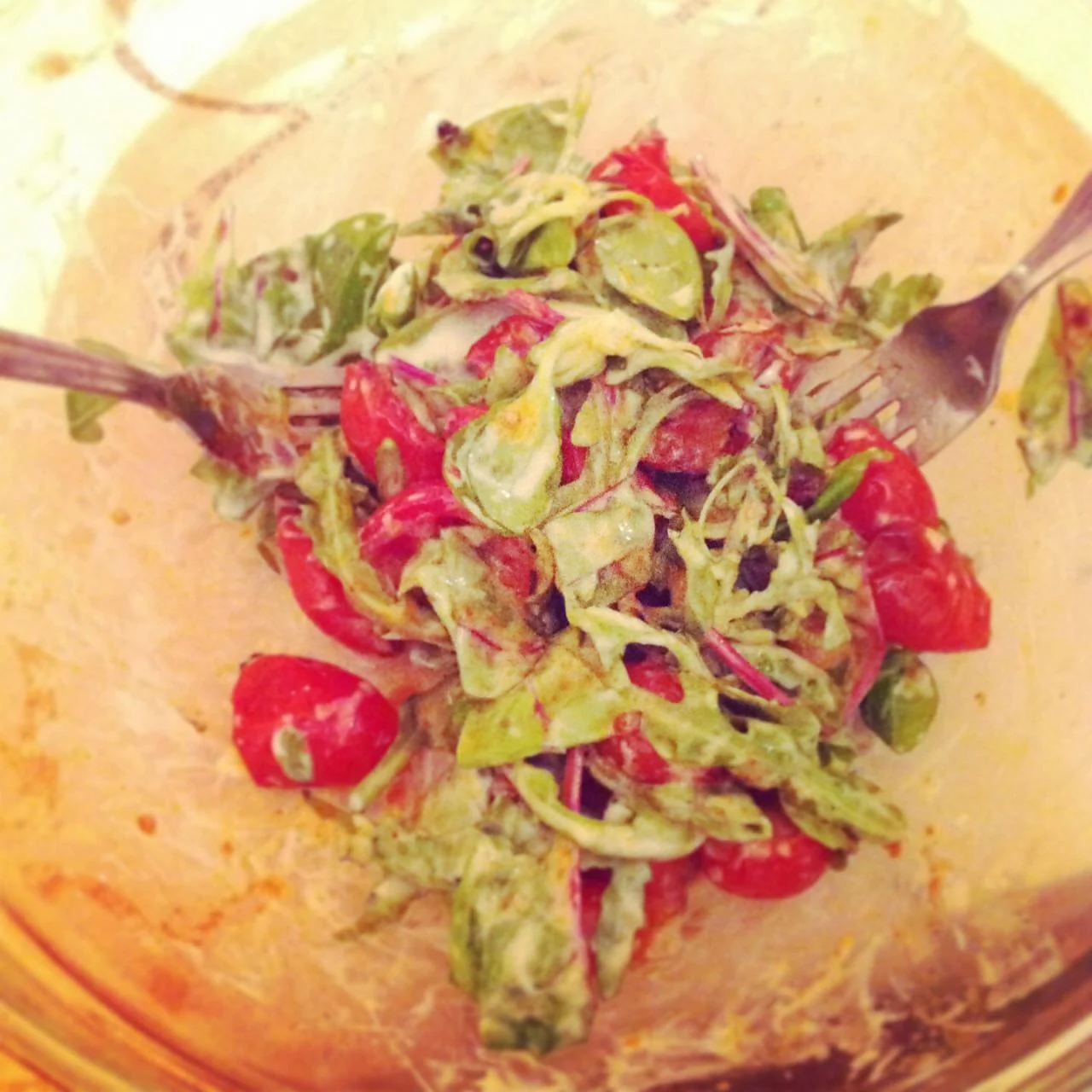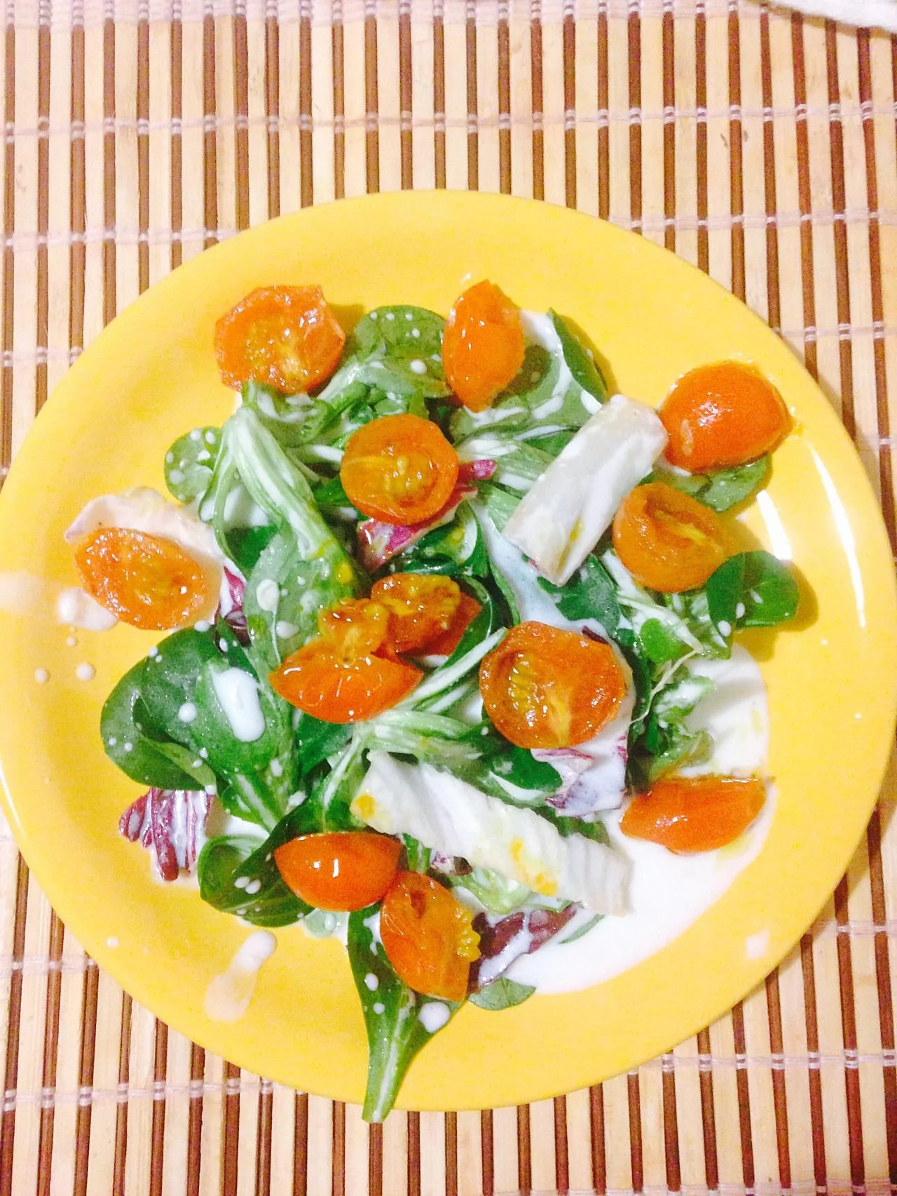 ШАГ 3 Заправить получившимся соусом смесь салатных листьев, украсить кольцами обжаренных томатов и подавать, когда они чуть остынут — или еще горячими, это уже дело вкуса.