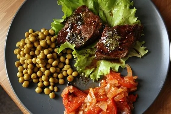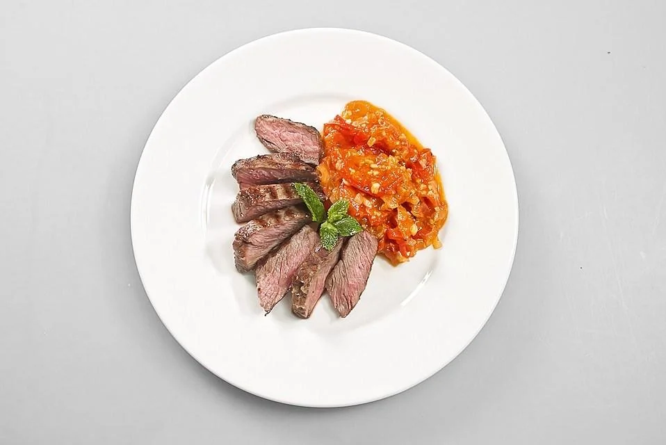 ШАГ 8 На тарелки красиво выложить нарезанные стейки — по пять-семь кусочков на порцию — и луково-помидорную поджарку. Сбрызнуть мясо и овощи небольшим количеством оливкового масла и украсить блюдо веточкой свежей мяты.