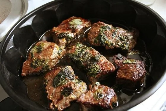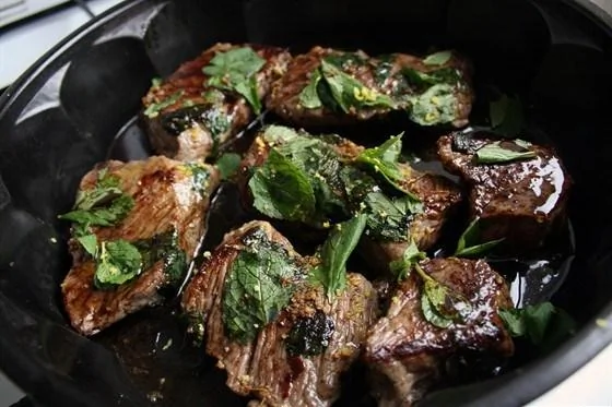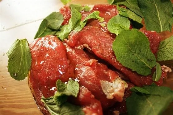 ШАГ 1 Говяжье филе нарезать на небольшие стейки примерно 3 см шириной. Натереть солью и черным перцем. Переложить мясо в миску, добавить листья мяты и пару чайных ложек оливкового масла. Перемешать руками и оставить мариноваться на двадцать-тридцать минут.