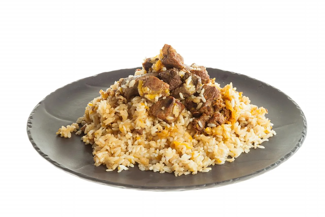ШАГ 2 Обжарить до золотистого цвета лук, а затем мясо, нарезанное крупными кубиками, — до румяной корочки, добавить морковь и готовить еще четверть часа. Добавить 2 столовые ложки соли, влить 700 мл воды, а когда закипит, всыпать барбарис и растертый в ладонях кумин. Убавить огонь под казаном, положить в него чеснок и оставить часа на полтора.