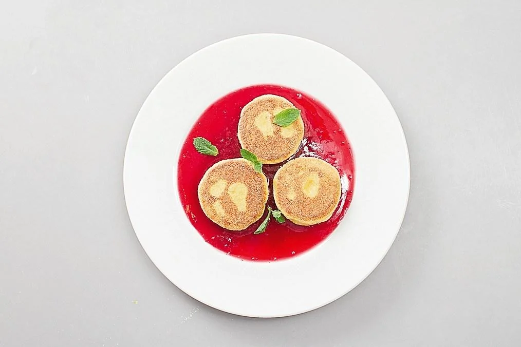 ШАГ 7 Сверху на протертое брусничное варенье выложить сырники — по две-три штуки на порцию в зависимости от их размера.