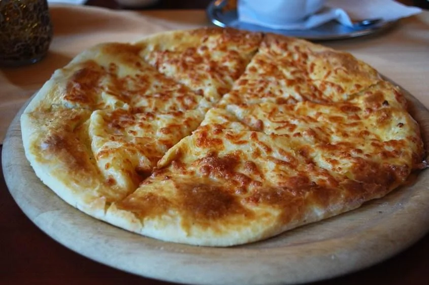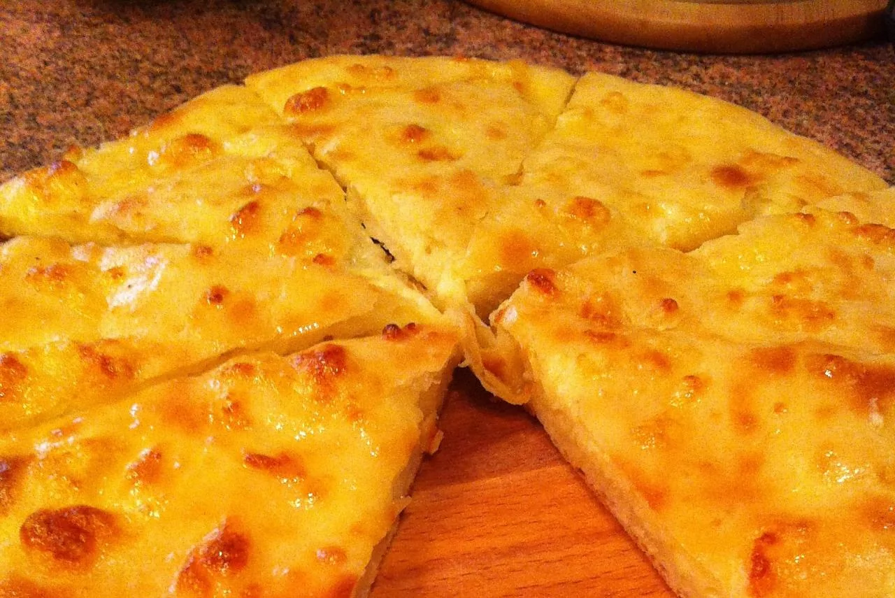 ШАГ 4 Выложить в центр каждого круга 150 грамм сырной начинки — смеси имеретинского сыра, сулугуни (70 грамм пока оставить) и обычного яйца. Соединить края теста и защипнуть. Чуть присыпать пироги мукой, снова раскатать их скалкой до диаметра формы для выпечки и толщины 8–10 мм.