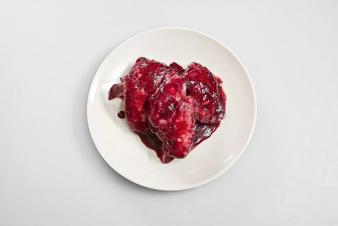 ШАГ 4 Остывшую курицу разделать на небольшие порционные кусочки, переложить их в глубокую миску и залить ежевичным соусом. Аккуратно перемешать мясо.