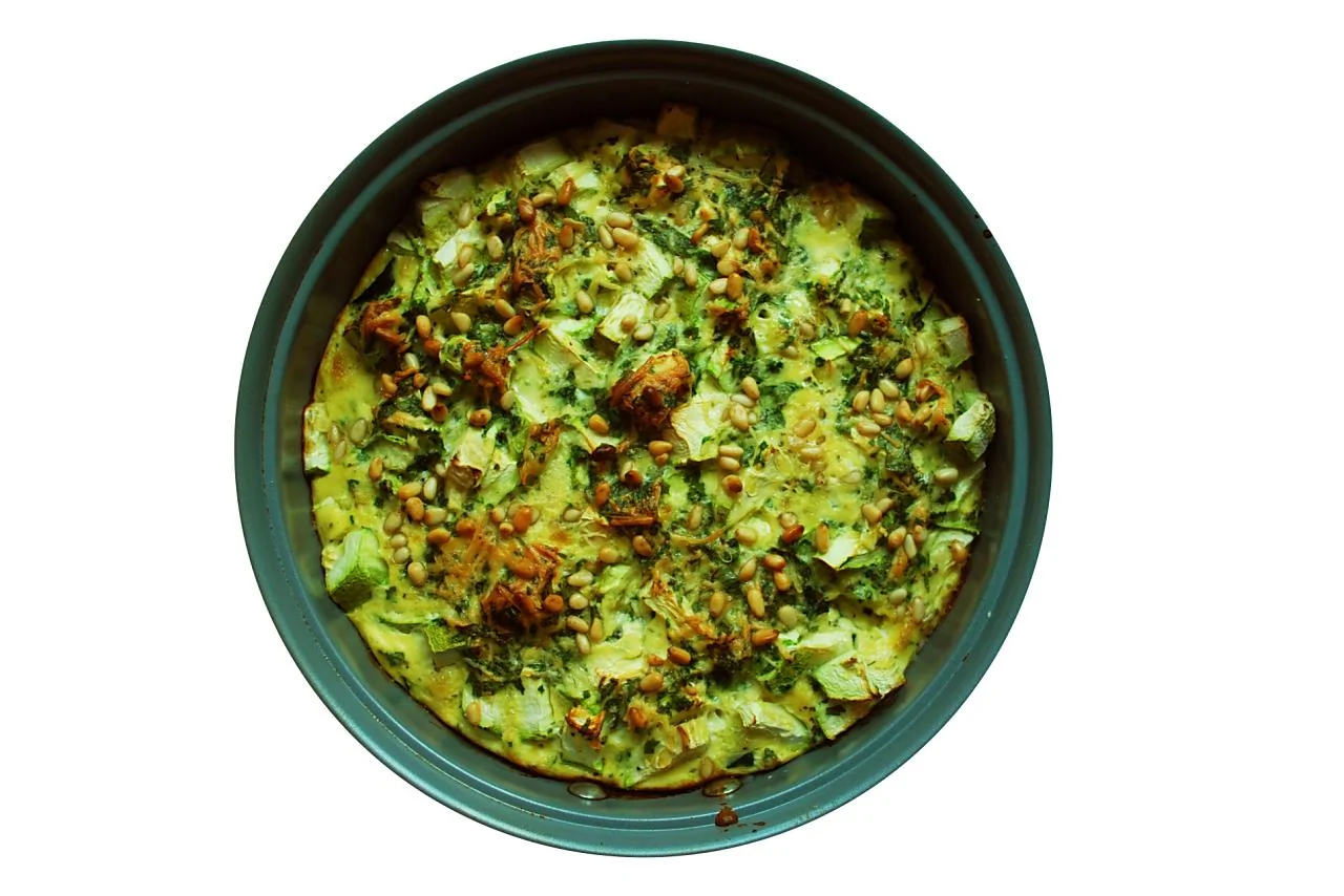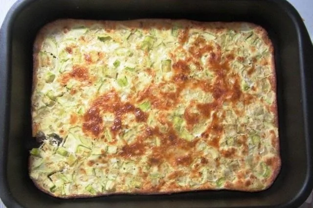ШАГ 4 Залить получившимся тестом кабачки, равномерно распределить смесь по всей форме. Поставить форму в духовку и запекать в течение сорока — сорока пяти минут.