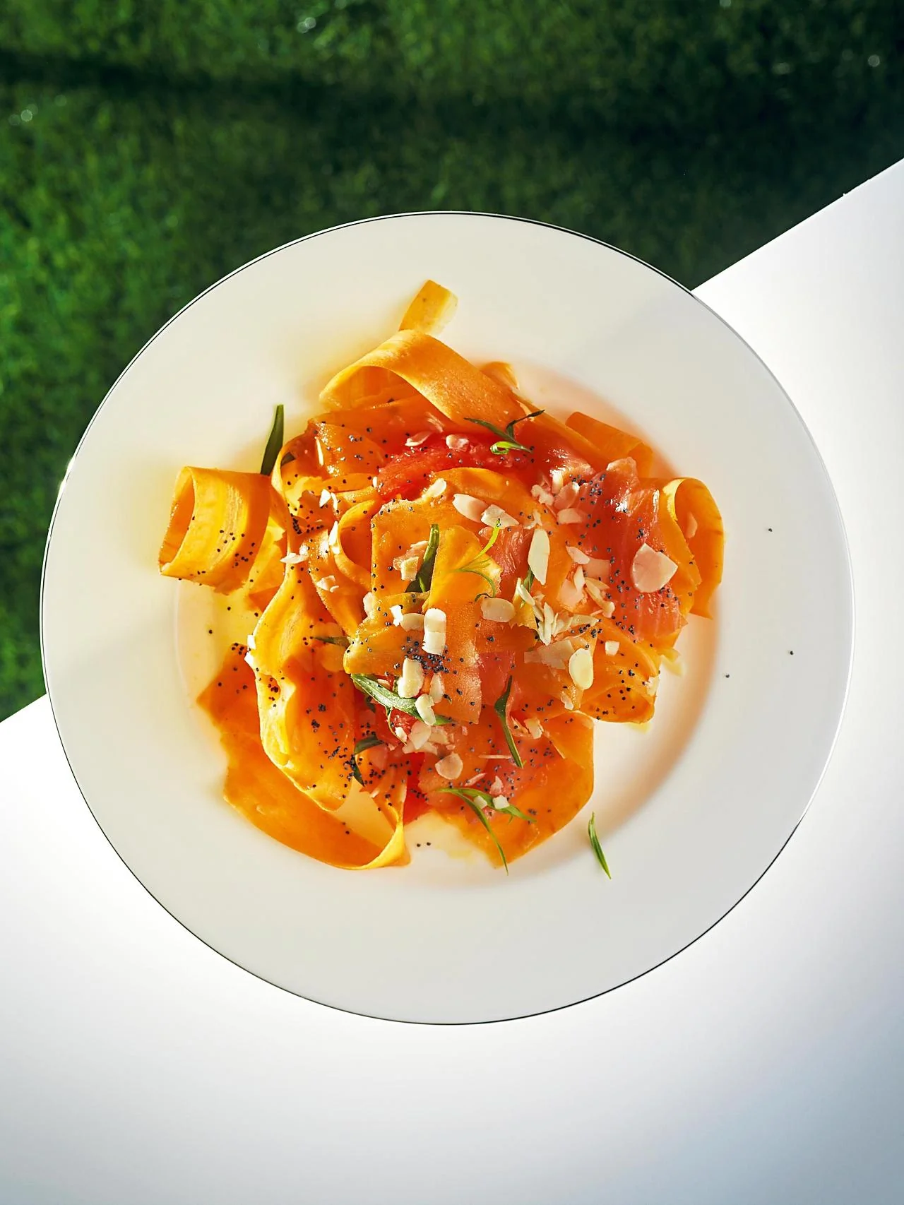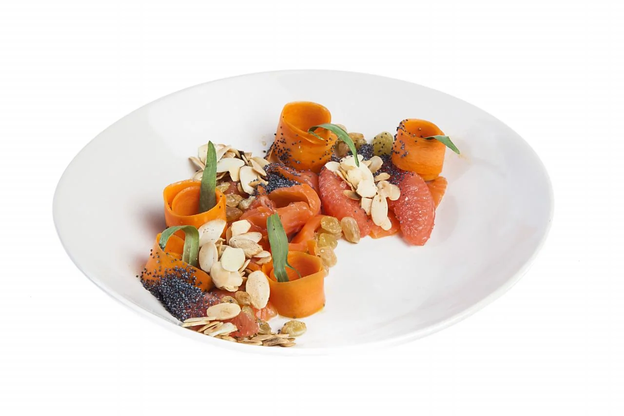ШАГ 3 Смешать соус с морковью, кусочками грейпфрутов, листьями эстрагона, изюмом и тонкими ломтиками слабосоленого лосося. При подаче посыпать миндальными хлопьями и маком.