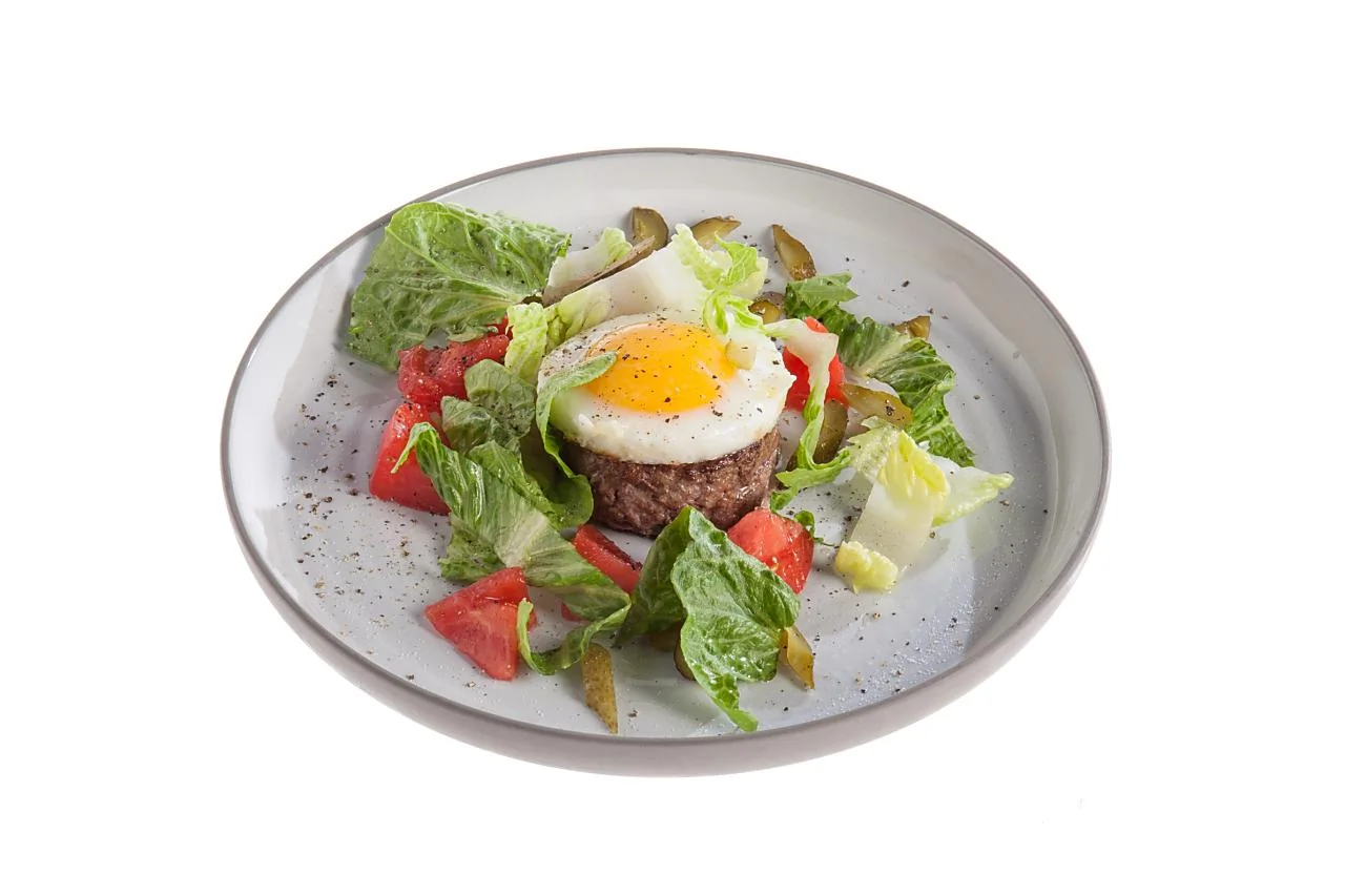 ШАГ 4 Пожарить шесть глазуний на сливочном масле. Нарубить латук соломкой, выложить на тарелки, сверху — котлету, несколько ломтиков помидора и огурца, накрыть яичницей и приправить солью и перцем.