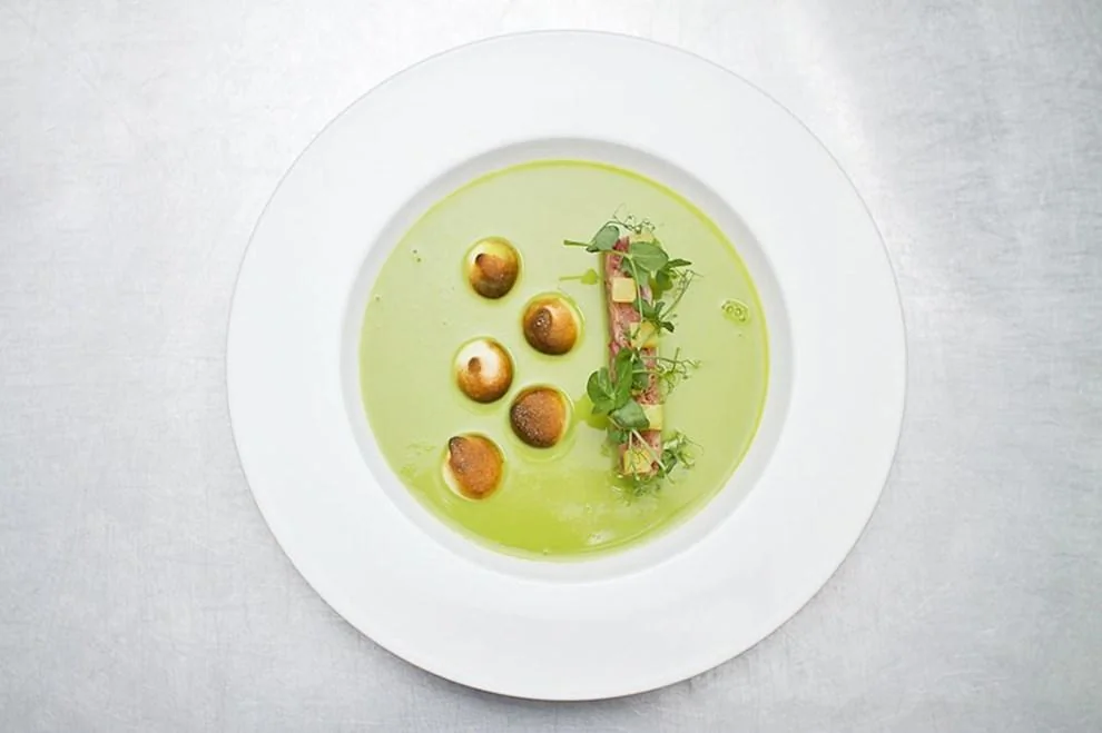 ШАГ 9 Быстро обжечь меренги кулинарной газовой горелкой до появления корочки. Горячий гороховый суп аккуратно влить в тарелку, чтобы жидкость не покрывала полностью брусок террина и меренги. Украсить свежей зеленью горошка.