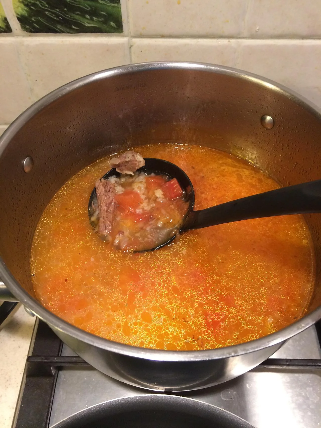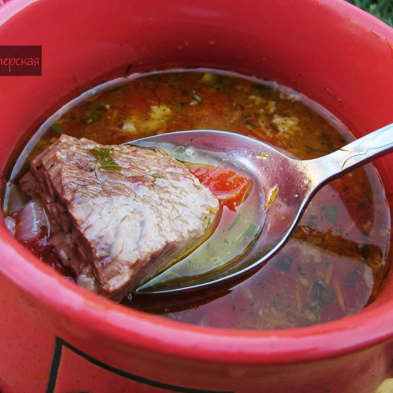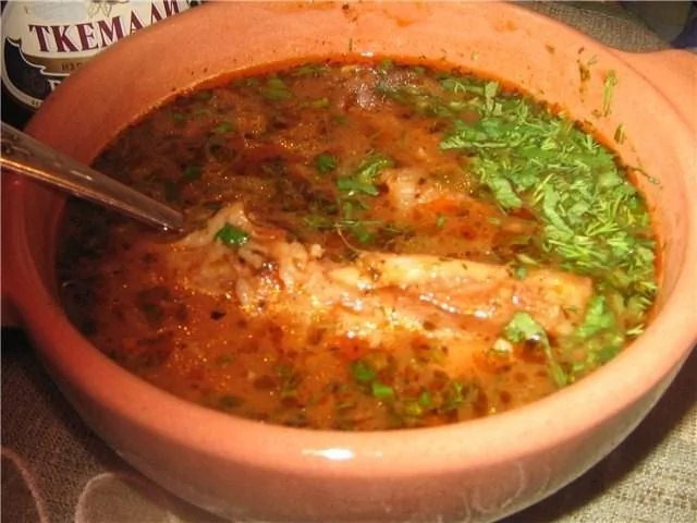 Говядина Лук репчатый Рис Помидоры Укроп Петрушка Специи Чеснок Кинза Пошаговые рецепты Супы Грузинская кухня Суп «Харчо»