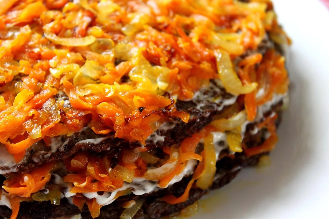 Ингредиенты для приготовления Печеночный торт с морковью и луком: