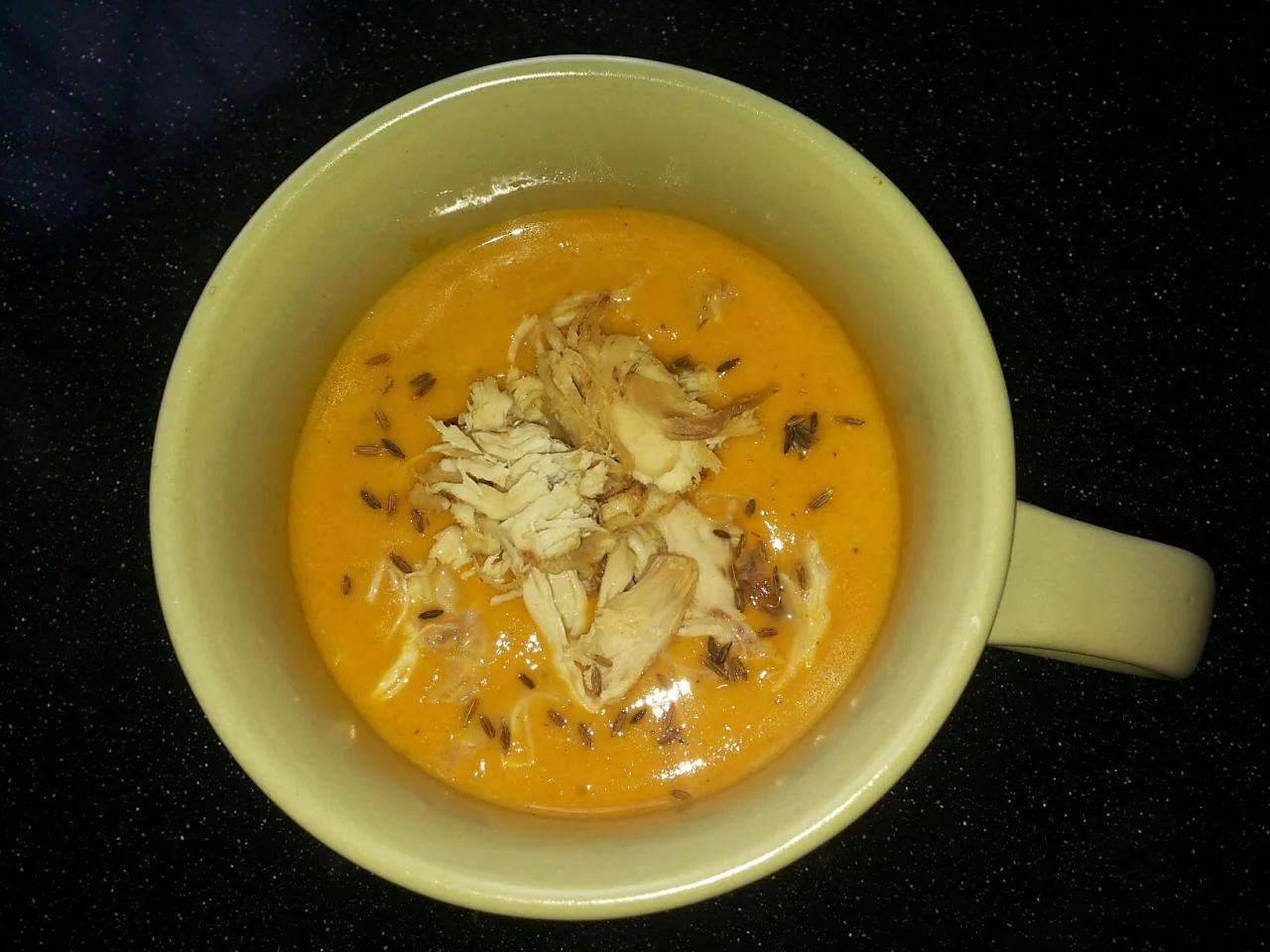ШАГ 4 Залить тыкву куриным бульоном, рыбным соусом и кокосовым молоком, готовить еще десять минут. После этого суп можно пробить блендером, чтобы довести до однородной кремовой консистенции.