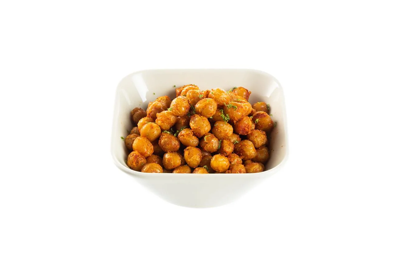 ШАГ 3 Готовый нут вынуть шумовкой, переложить на бумажное полотенце, а затем, когда впитаются излишки масла, переложить горох в миску, посыпать смесью паприки и кайенского перца, посолить по вкусу, посыпать цедрой лайма, перемешать и тут же подавать.