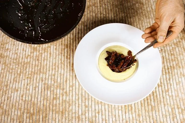 ШАГ 5 Когда печенка уже почти близка к готовности, надо взять полкило отварной картошки и превратить ее в пюре, добавив молока, сливок или растопленного сливочного масла — в зависимости от диетических убеждений. Пюре надо выложить в центр тарелки, сделать небольшое углубление, внутрь которого укладывается телячья печень. Сверху печень украшается свежей петрушкой.