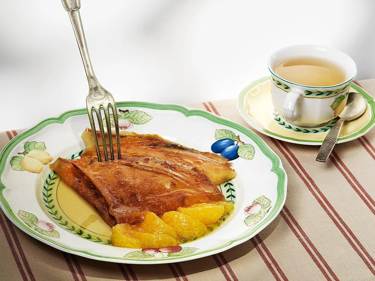 ШАГ 8 На подогретые тарелки выложить блинчики (по два на порцию), украсить дольками мандарина. В сковороду добавить оставшийся ликер, перемешать и полить этим соусом блинчики и мандариновые дольки.