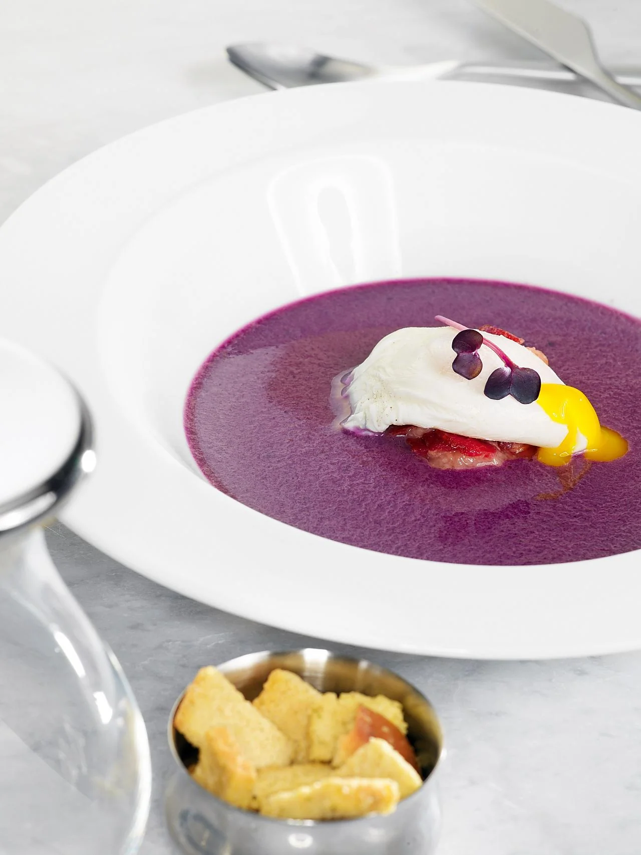 Суп из краснокочанной капусты с яйцом пашот и копченой уткой