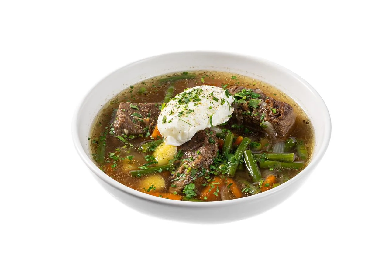 Свежая кинза (кориандр) Говяжья пашина Яйцо куриное Морковь Желтый лук Картофель Стручковая фасоль Зеленый горошек Чеснок Растительное масло Белый винный уксус Листья сельдерея Петрушка Молотый кумин (зира) Сушеный орегано Соль Свежемолот