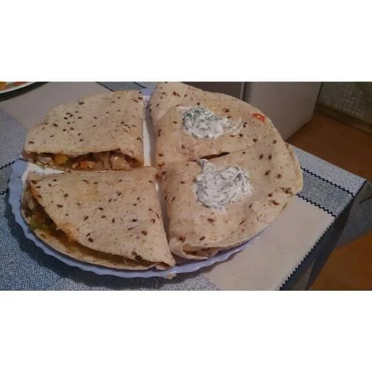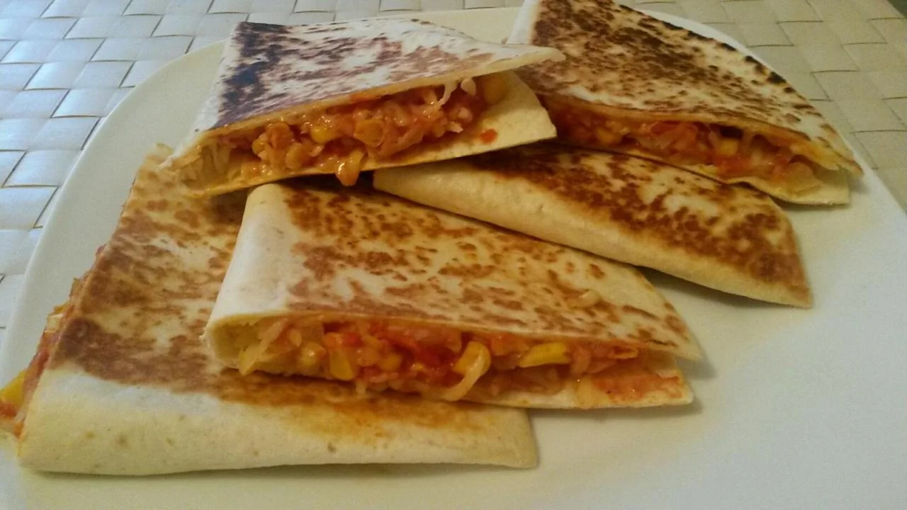 ШАГ 4 В тортилью на половину посыпать сыр, затем выложить начинку, сверху — еще слой сыра, накрыть второй половиной тортильи, разрезать пополам (как на картинке) и обжарить на сковороде или гриле 2–3 минуты с одной стороны, затем аккуратно перевернуть и поджарить с другой стороны еще 1–2 минуты.