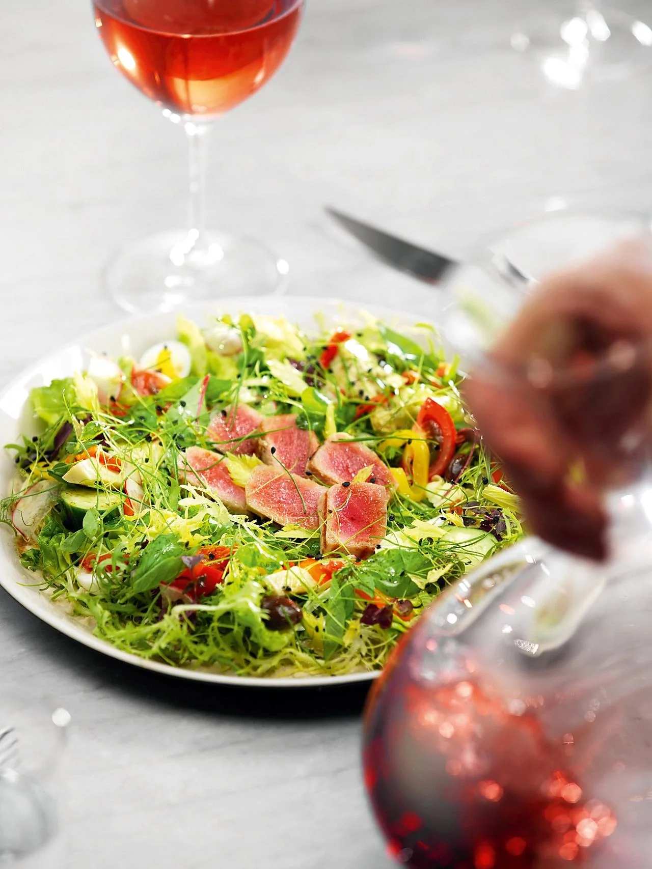 Тунец Консервированный тунец Перепелиное яйцо Маринованные мини артишоки Огурцы Помидоры Вяленые помидоры Сладкий перец Маслины Редис Смесь салатных листьев Салат мини романо Листья сельдерея Кресс-салат Мед Яичный желток Дижонская горчиц