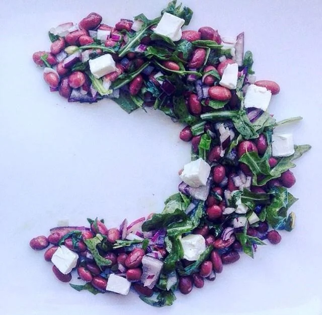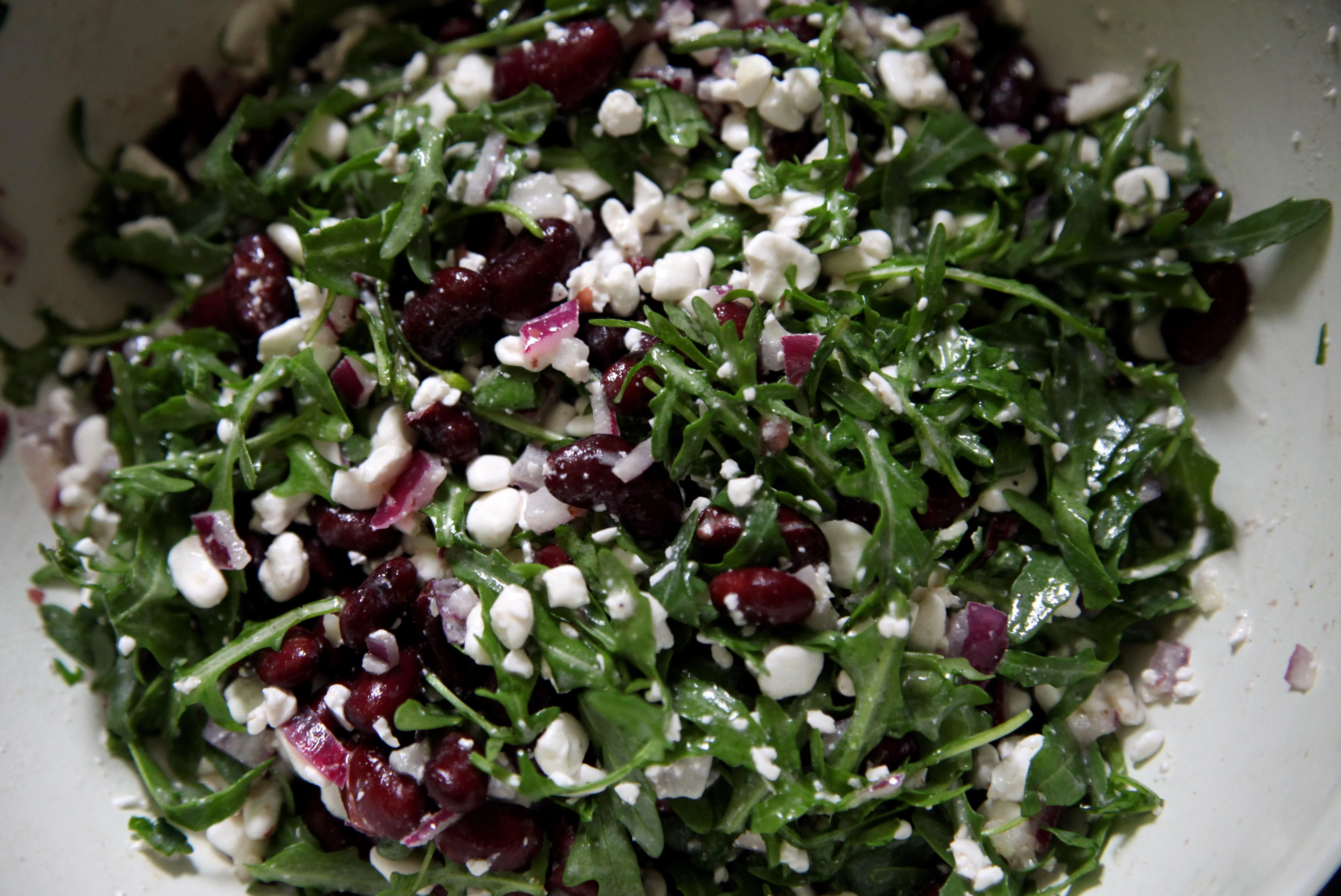 Салат из красной фасоли с творожным сыром, красным луком и сезонным салатом