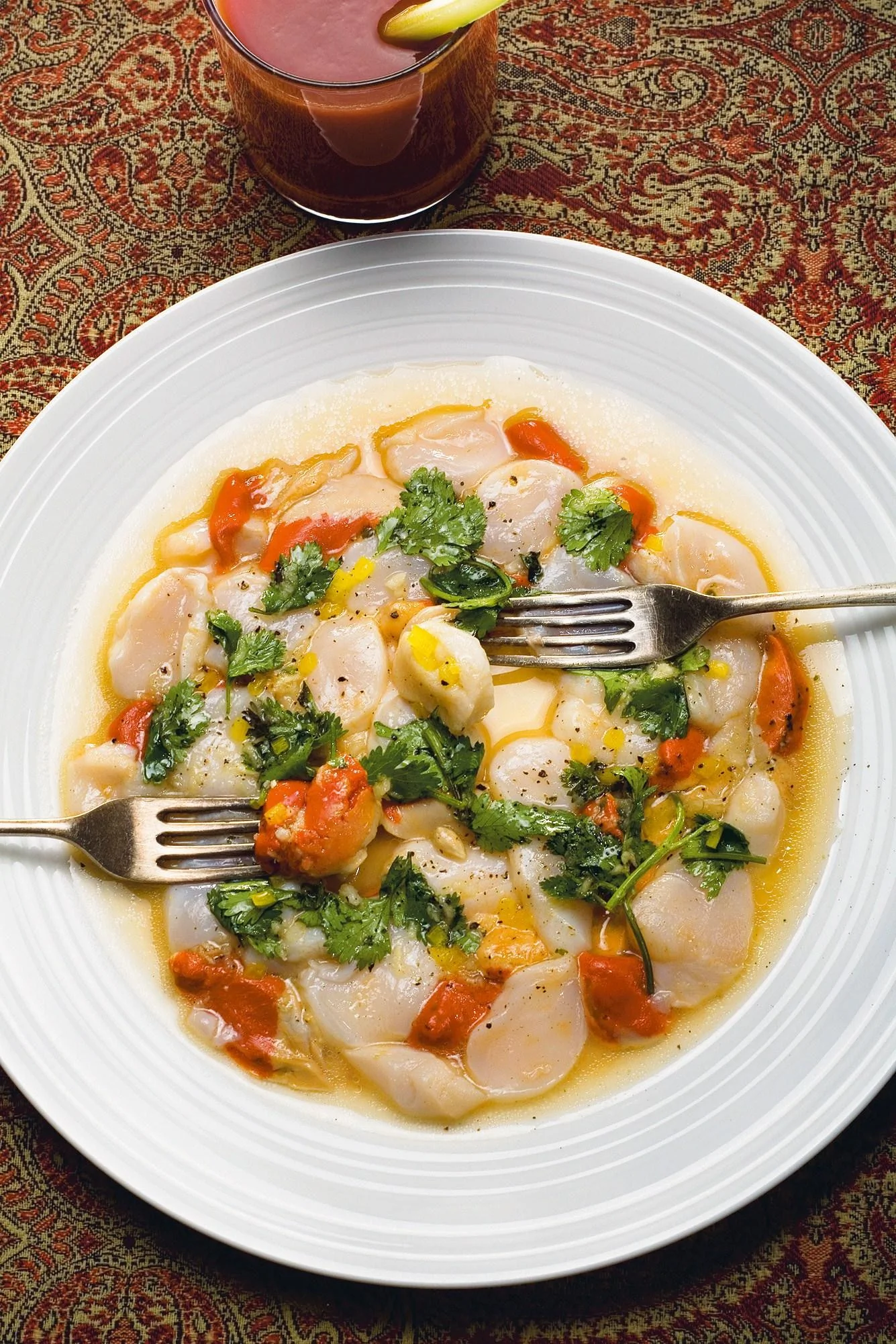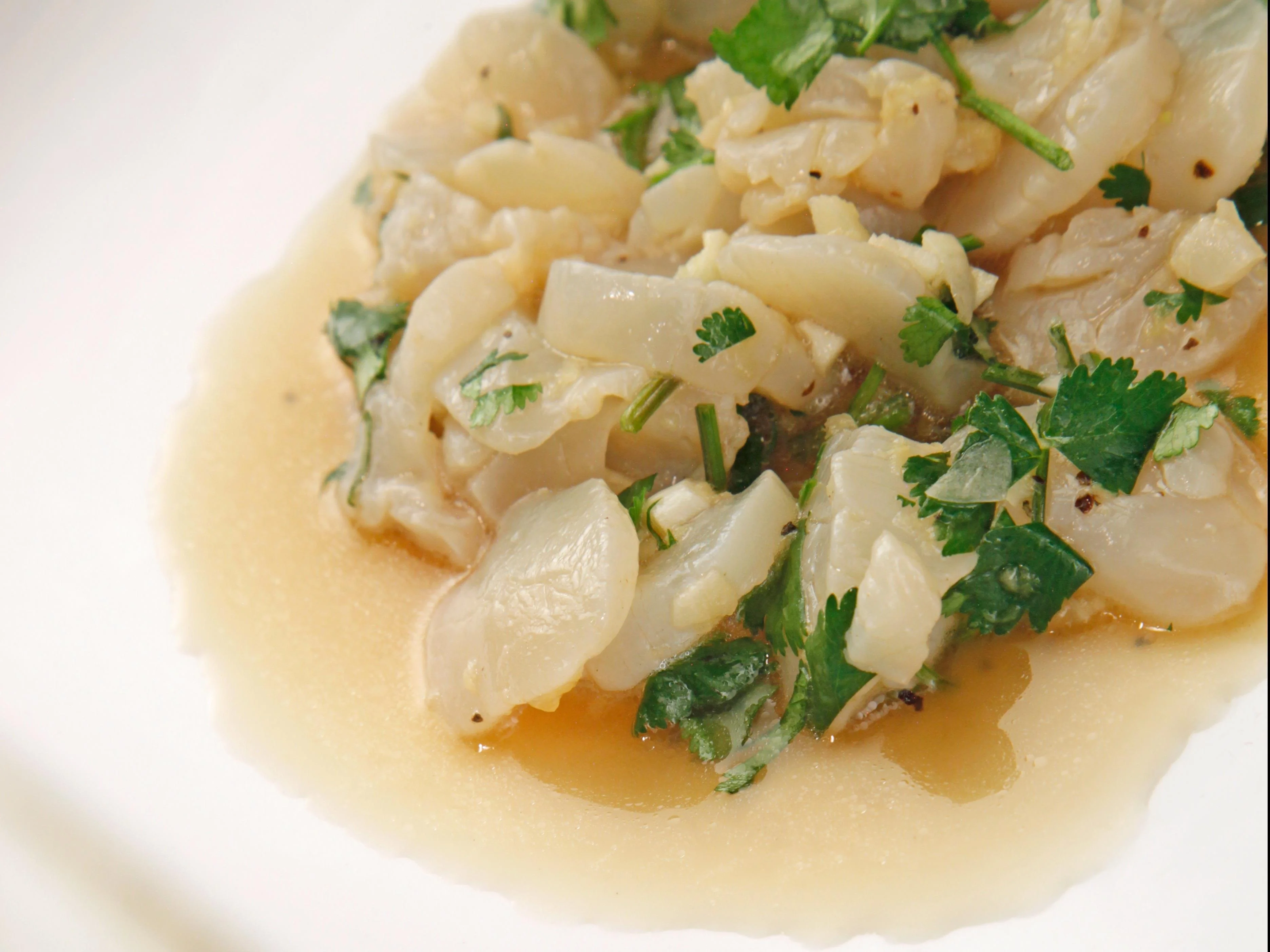 ШАГ 4 Мускулы гребешков нарезать тонкими ломтиками, залить соусом, помариновать пять минут. И можно есть. Настолько тактильного ощущения свежести не дают ни одна зубная паста, ни мятная жвачка.