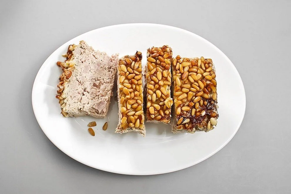ШАГ 7 Получившуюся массу переложить в большую терринницу. Сверху щедро посыпать кедровыми орешками. Поставить форму с террином в глубокий противень и залить горячей водой чуть больше чем на 2/3 высоты. Поместить в духовку на пять-десять минут. Проверить готовность, воткнув ножик до середины: если лезвие обжигает, значит, террин готов.