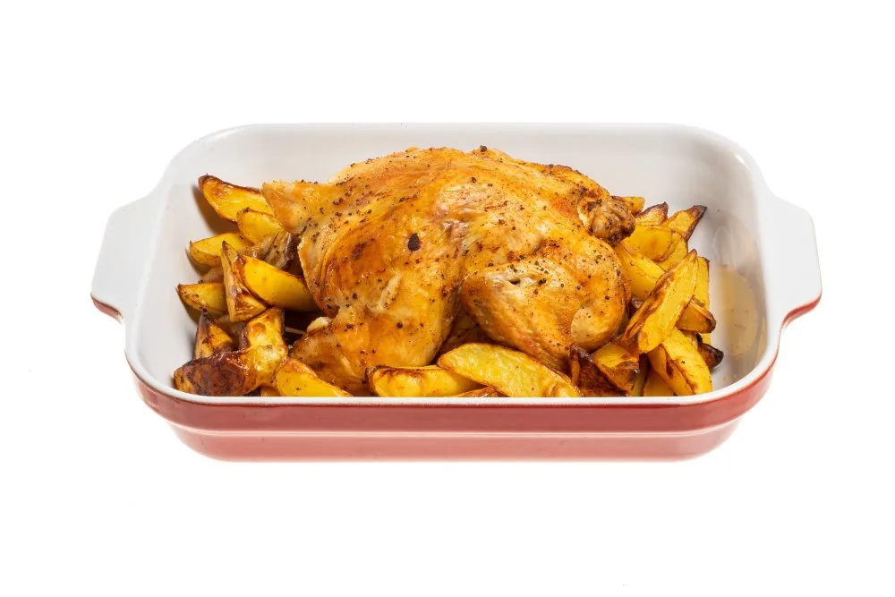 ШАГ 3 На противень выложить картофель, в центр курицу. Отправить в духовку и готовить минимум один час: в готовой курице не должно остаться крови. Подавать с большим количеством зелени и овощей.