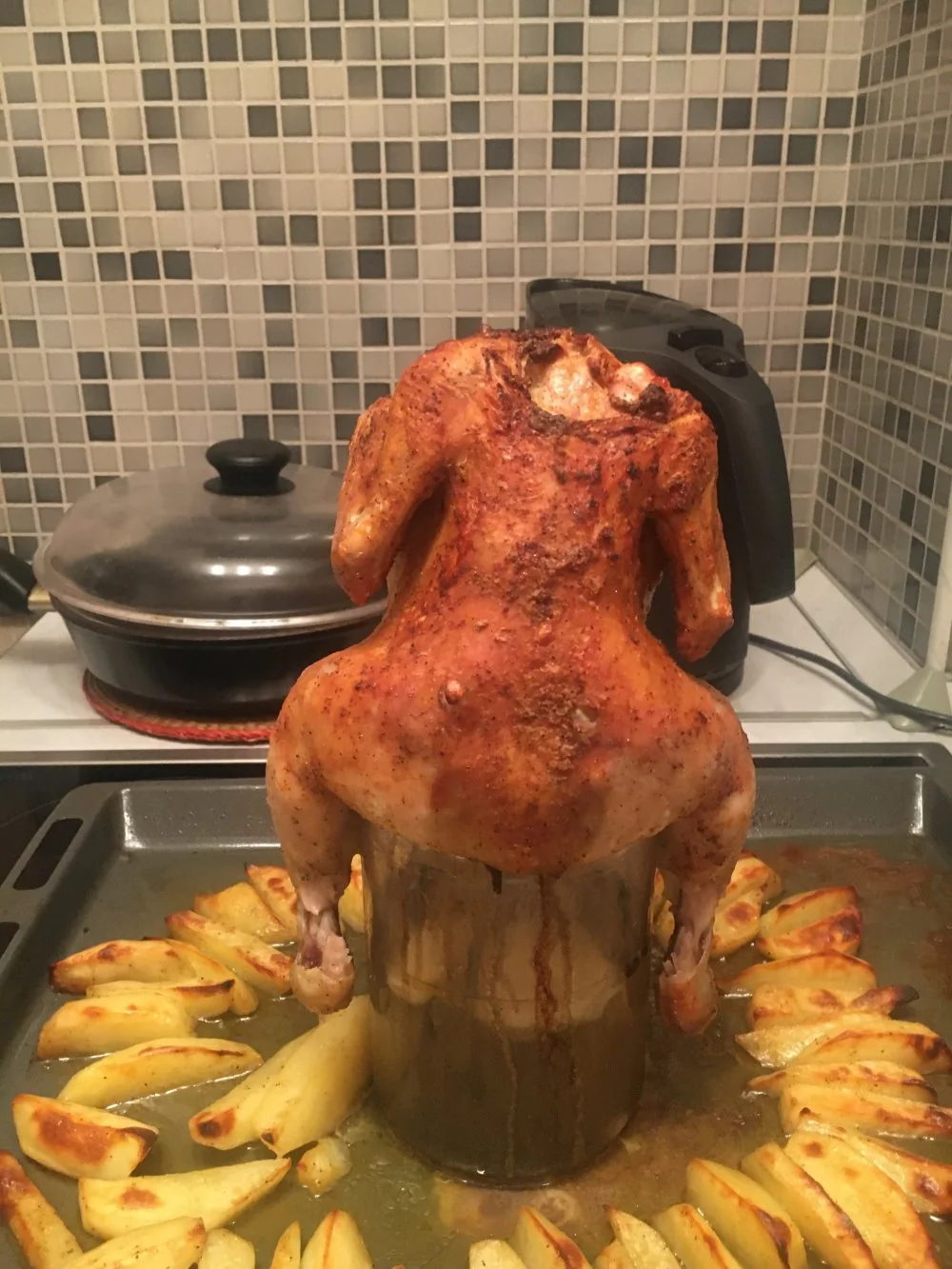 ШАГ 2 В банку подходящего размера налить горячую воду, положить половину луковицы, лавровый лист, и перец горошком, усадить на банку курицу.