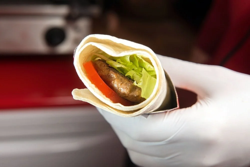 ШАГ 4 Лаваш сложить пополам и на него поочередно выложить салат, три котлетки, перец чили, помидоры, лук и сыр. Затем свернуть, подогнуть снизу и крепко завернуть в бумагу, чтобы не развалилось в руках.