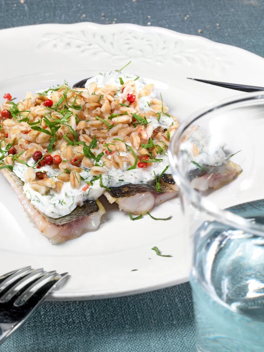 ШАГ 3 Полбу залить водой примерно на палец, кинуть в кастрюльку щепотку соли и варить на медленном огне двадцать минут, после чего снять с огня, накрыть крышкой и дать постоять десять минут. Выложить на тарелку рыбу, сверху сдобрить смесью огурцов и сметаны, посыпать полбой и розовым перцем, если нравится его кисловатый привкус.