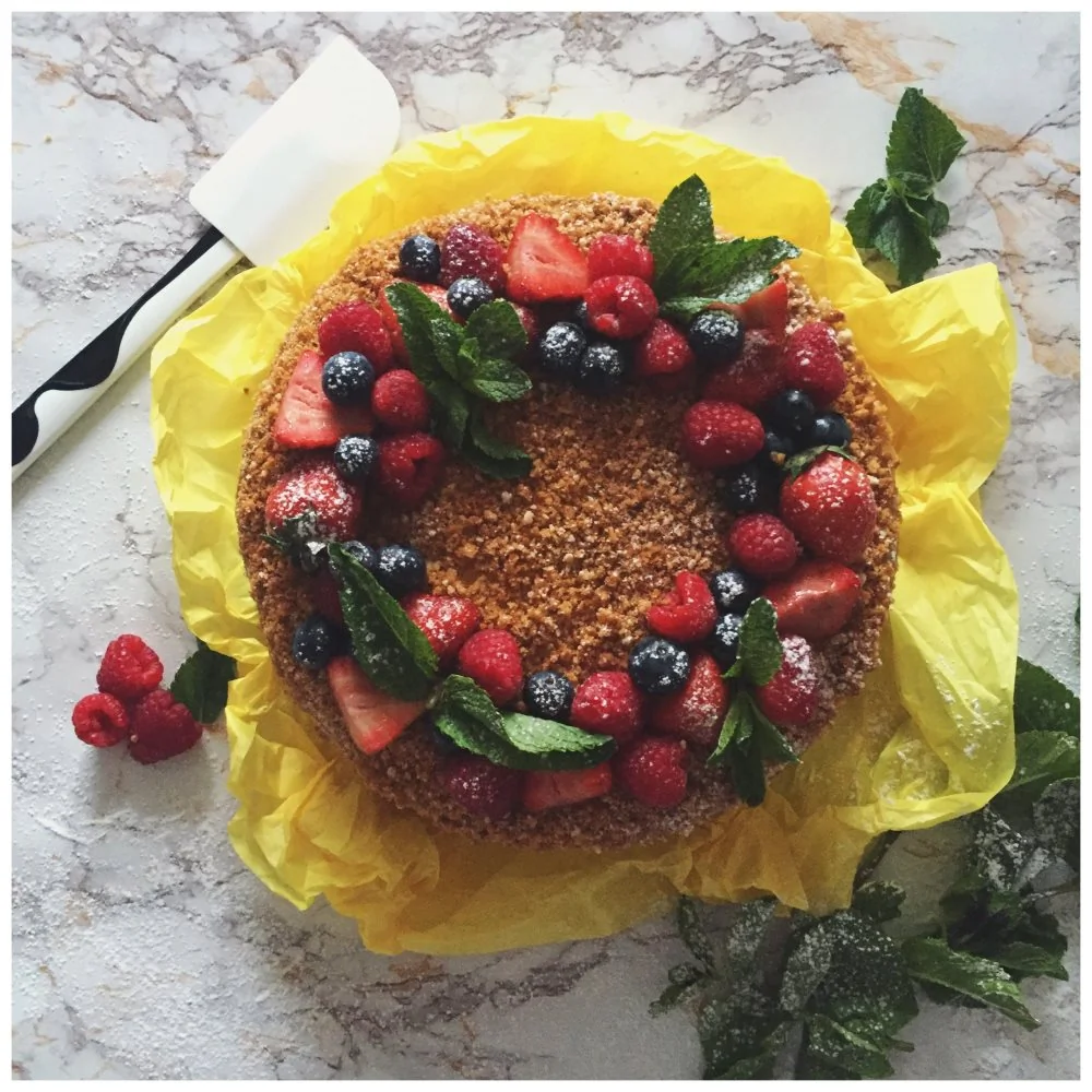 ШАГ 8 Сложить торт: первый корж выложить запеченной стороной вверх, промазать кремом, а следующие — запеченной стороной вниз. Верхушку тоже промазать кремом. Лишний корж размолоть в блендере до состояния мелкой крошки. Обсыпать ею торт со всех сторон.