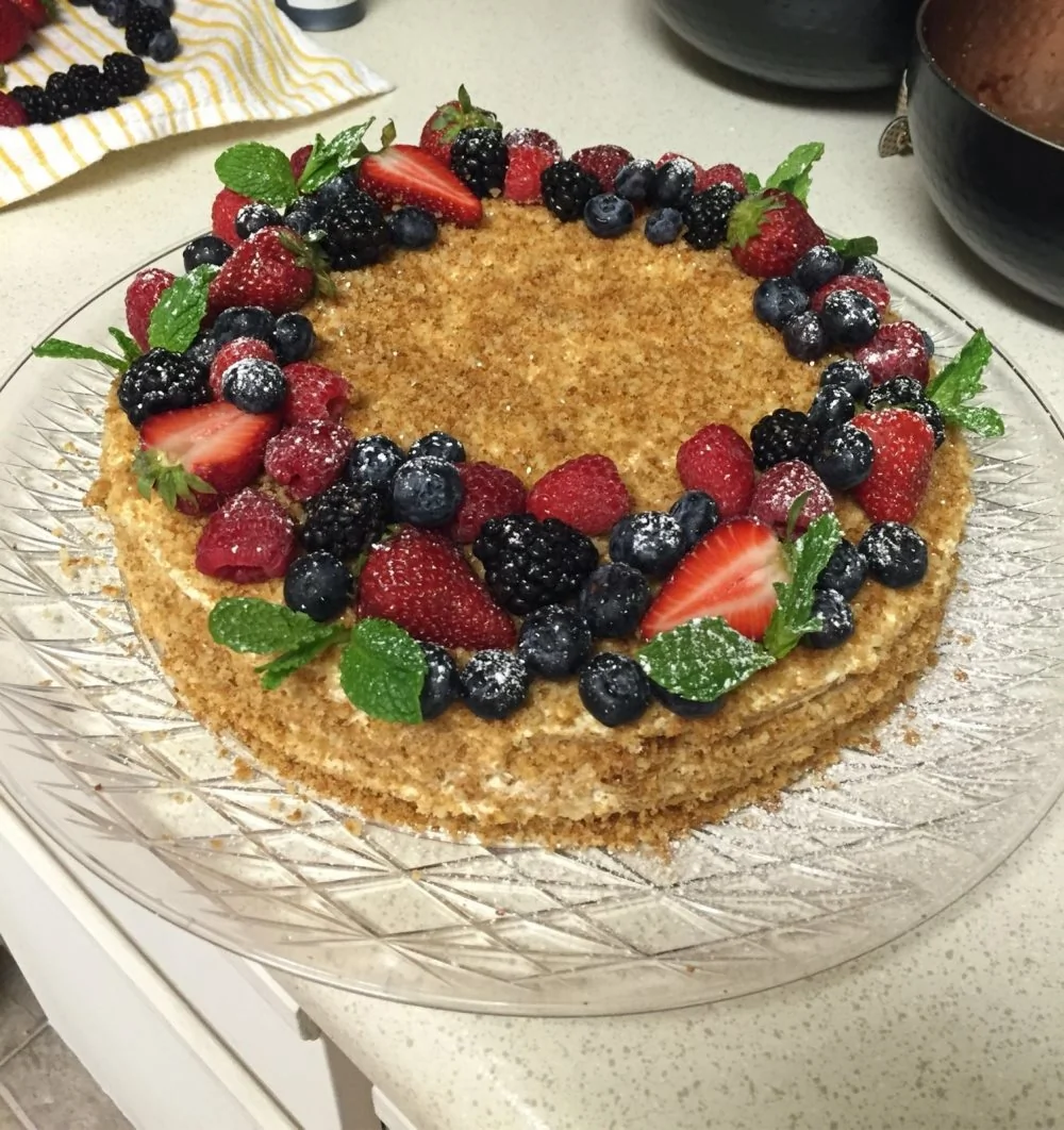 ШАГ 9 Готовый торт можно украсить пудрой и медом, затем убрать в холодильник на ночь, а лучше на сутки: за это время он опустится примерно в полтора раза и пропитается кремом.