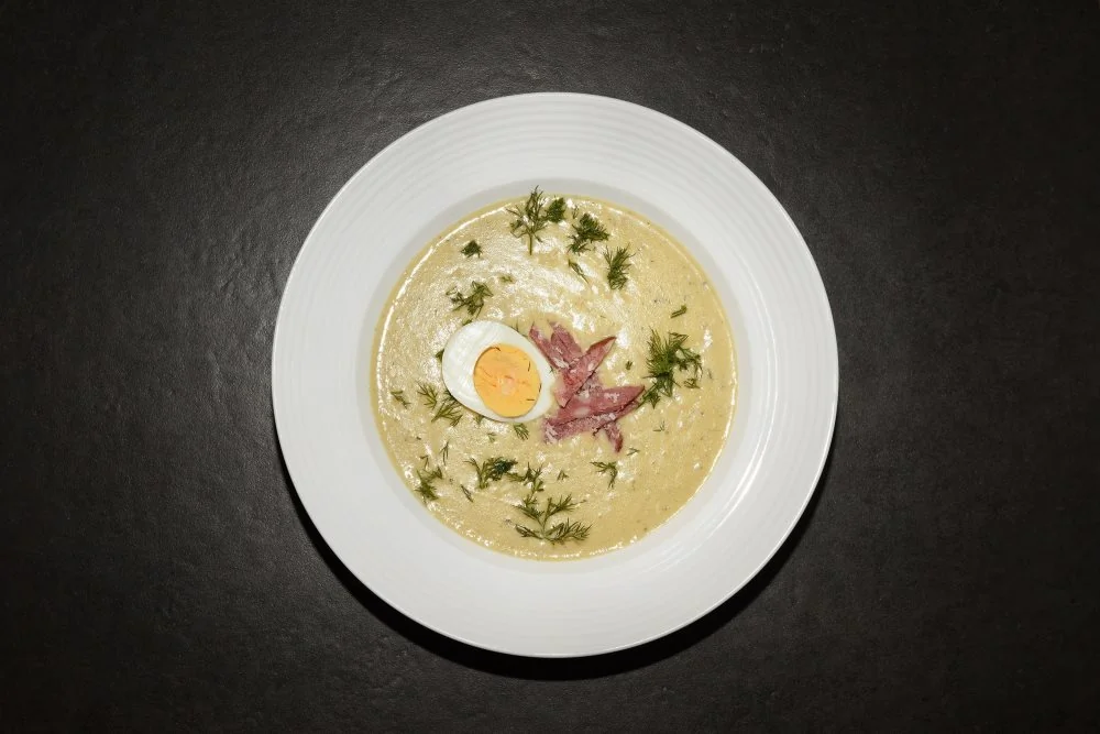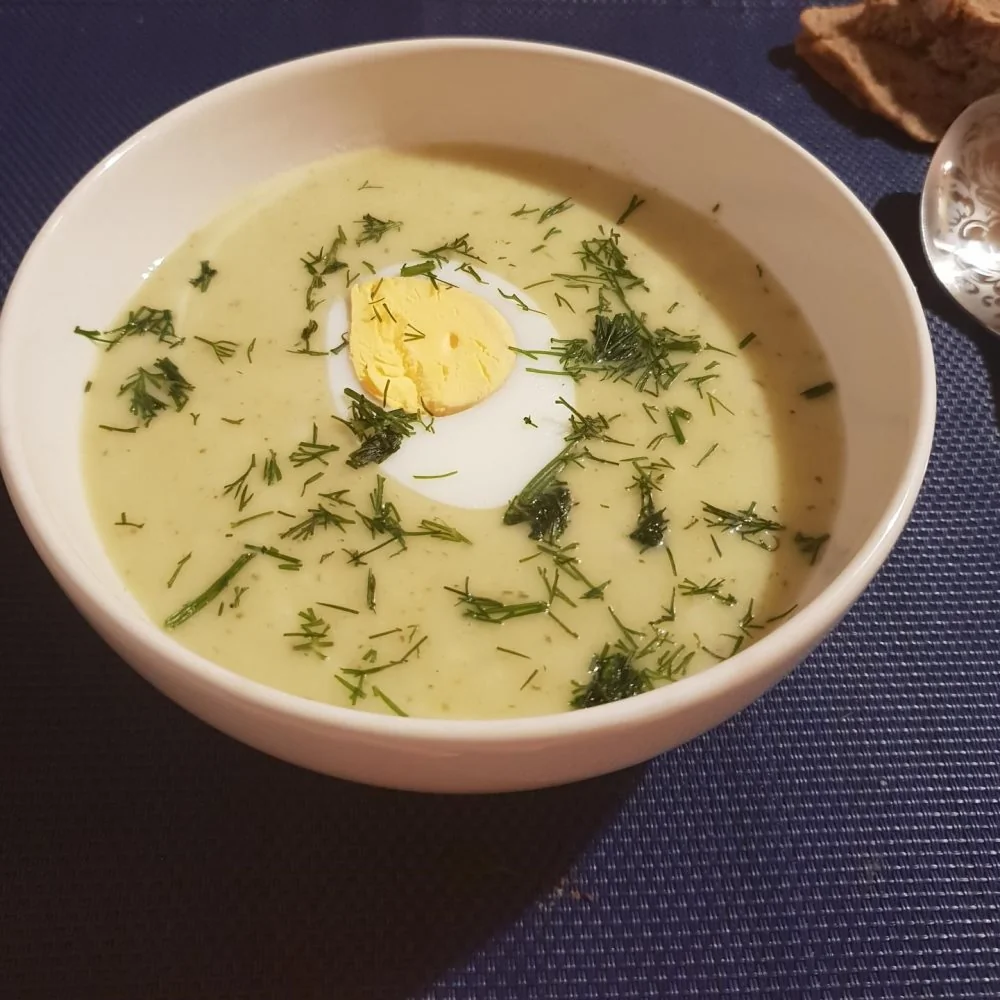 ШАГ 5 В отдельной миске взбить сметану и муку, добавить примерно 100 мл супа и перемешать до однородности. Влить получившуюся смесь в суп, перемешать и поварить до загустения примерно пять минут. Колбасу нарезать ломтиками толщиной 1 см и добавить в суп вместе с тертым хреном. Посолить, поперчить, разлить по тарелкам и посыпать порции зеленью. Украсить разрезанными пополам яйцами.