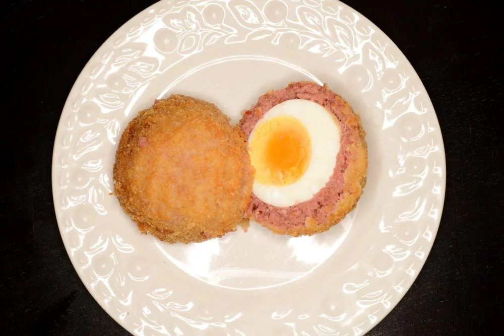 ШАГ 2 Извлечь фарш из оболочки. Смешать его с горчицей, крахмалом, мускатным орехом и измельченными тимьяном и шалфеем. Разделить на 6 равных частей, размять каждую в лепешку и обернуть вокруг каждого яйца. Выложить на блюдо и отправить в холодильник на полчаса.