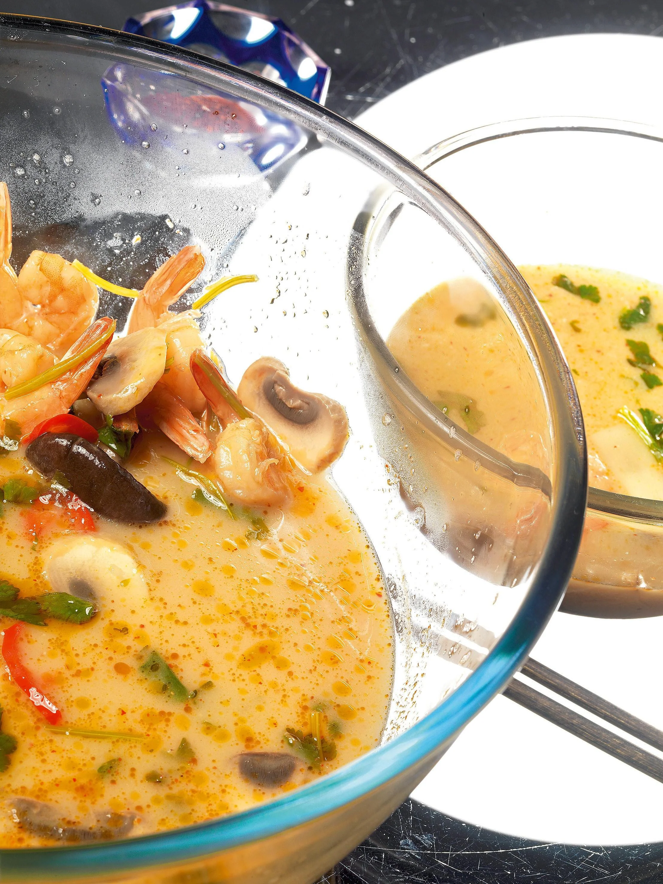 ШАГ 3 Затем добавить рыбный соус, сахар, еще через две минуты креветки, нарезанные грибы, перец чили, наструганный кольцами, и кокосовое молоко.