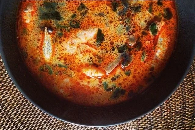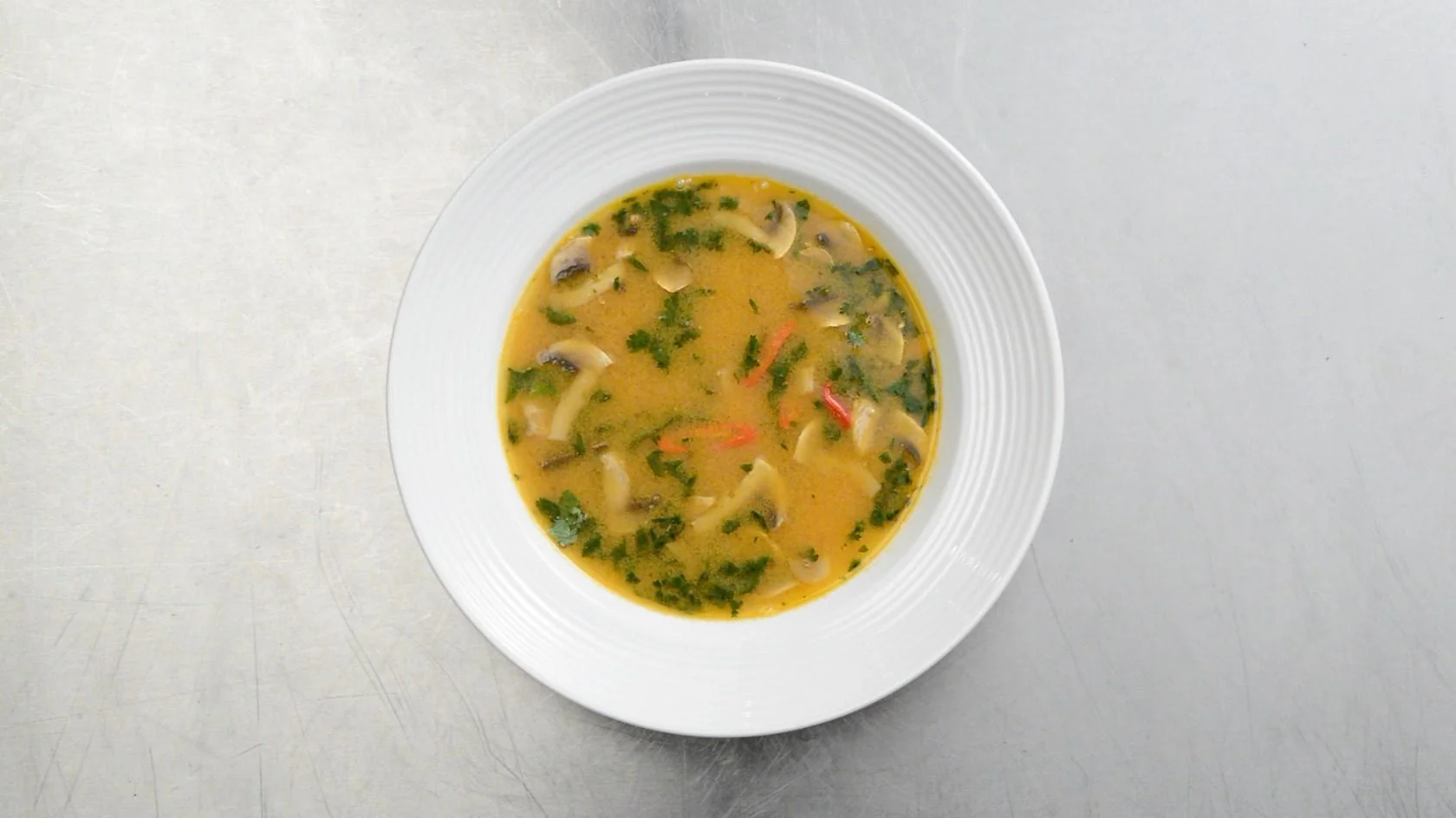 ШАГ 1 В куриный бульон добавить мелко нарезанный имбирь, листья лайма, лимонную траву (две столовые ложки сухой или два стебля свежей) и варить пять минут.