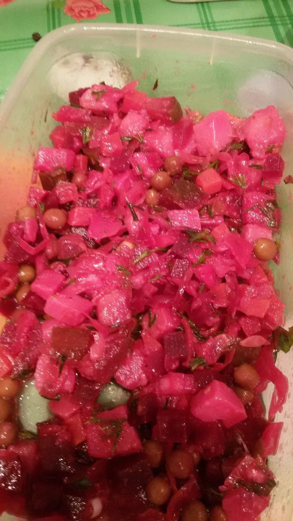 ШАГ 2 Лук и соленые огурцы нарезать кубиком вдвое меньшим, чем корнеплоды.
