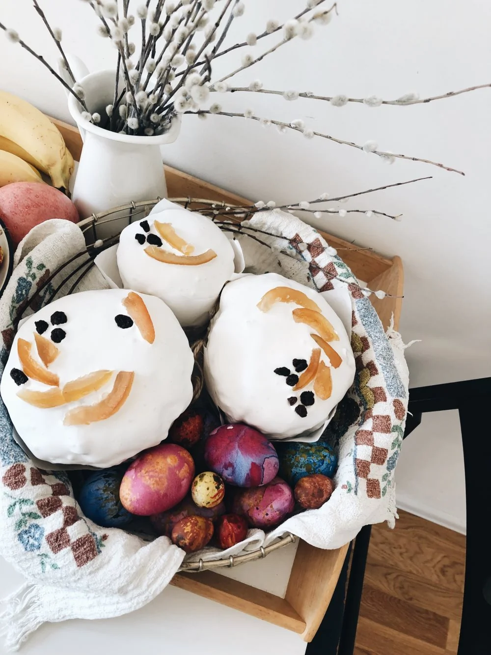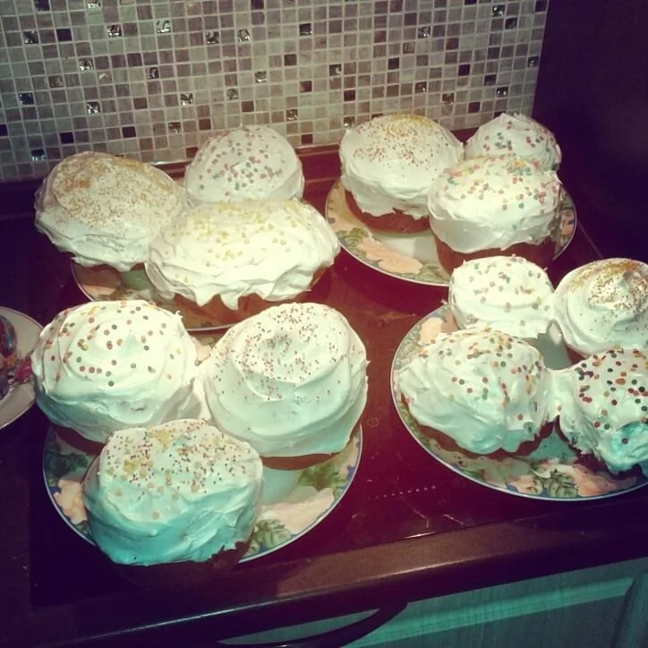 ШАГ 10 Для глазури: 3 белка взбить добела, постепенно всыпая сахарную пудру. Добавить лимонный сок, продолжая взбивать. Нанести глазурь на остывшие куличи.