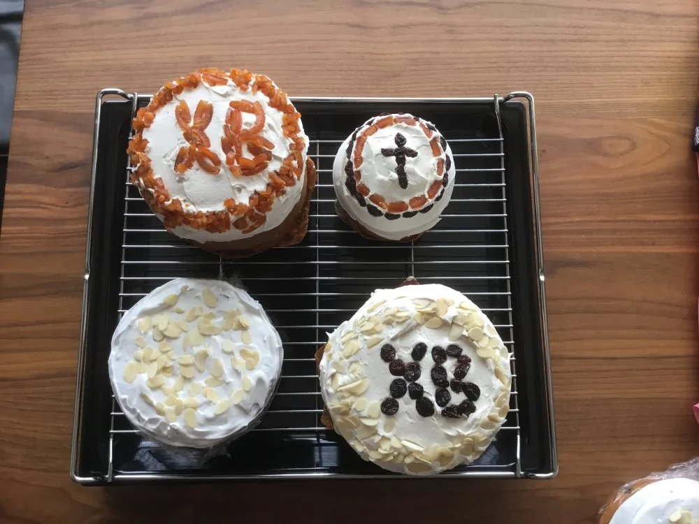 В разогретую до 160 градусов духовку осторожно поместить куличи. Не открывать духовку первые 40 минут. После того как куличи поднялись, увеличить температуру до 180 С. Через 50 минут после начала выпекания проверить шпажкой, пропеклось ли тесто. Если тесто еще не пропеклось, а верх кулича начинает подгорать, накрыть его фольгой.