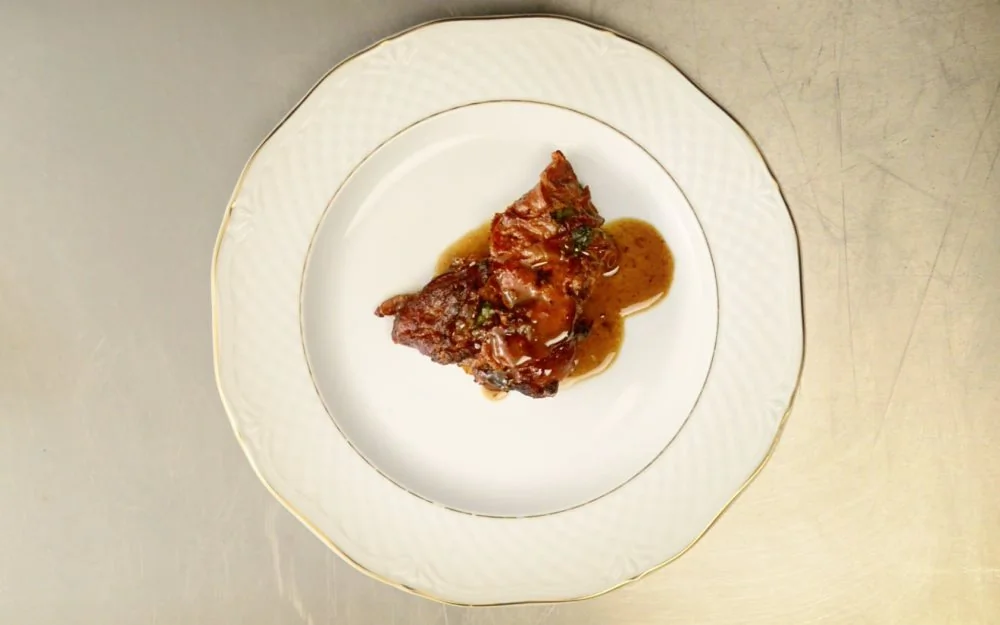ШАГ 3 В глубокой сковороде с толстым дном растопить 3 столовые ложки сливочного масла — пока оно не начнет пузыриться. Обжарить мясо, выкладывая его шалфеем вниз, до золотистой корочки.