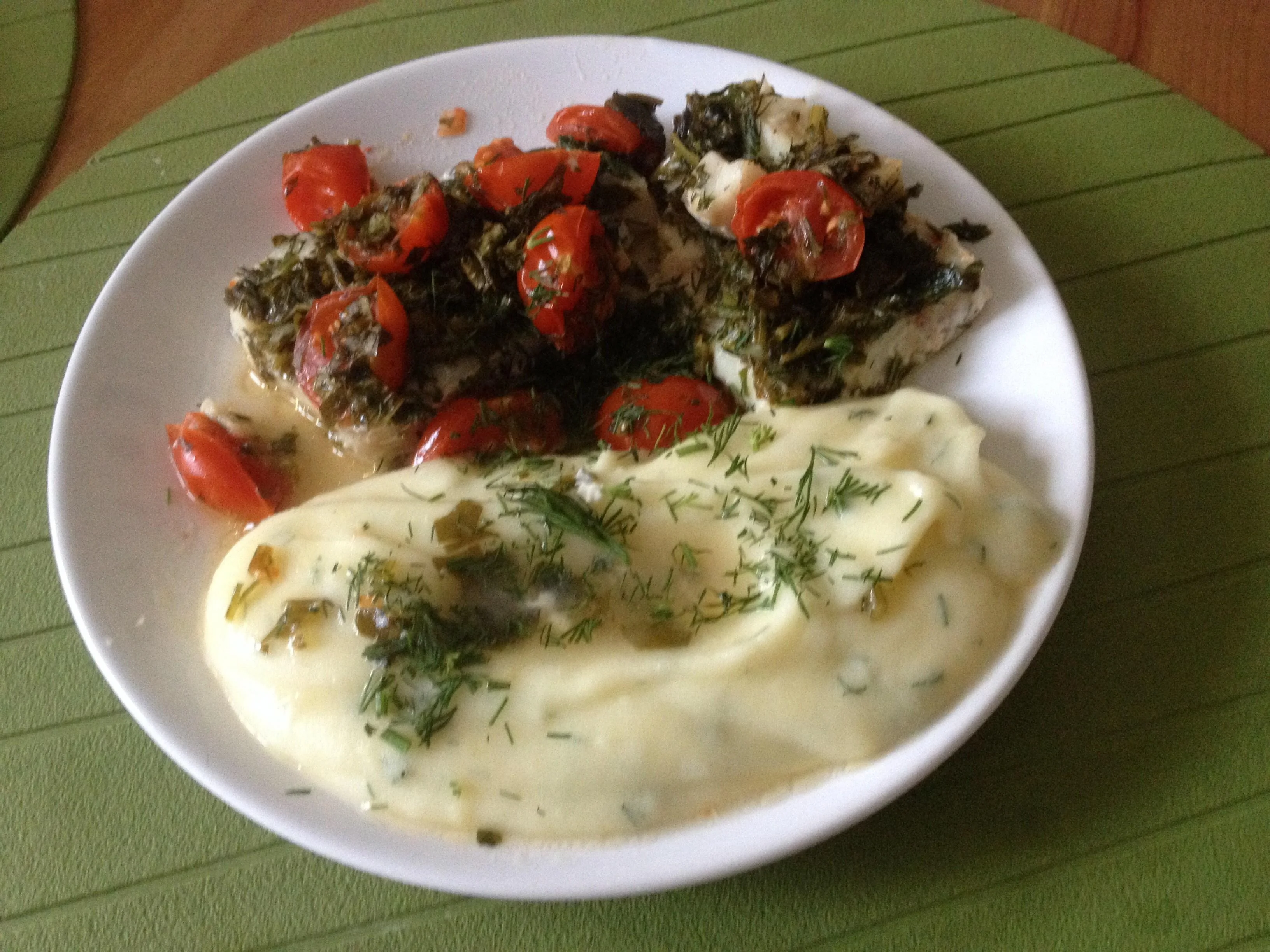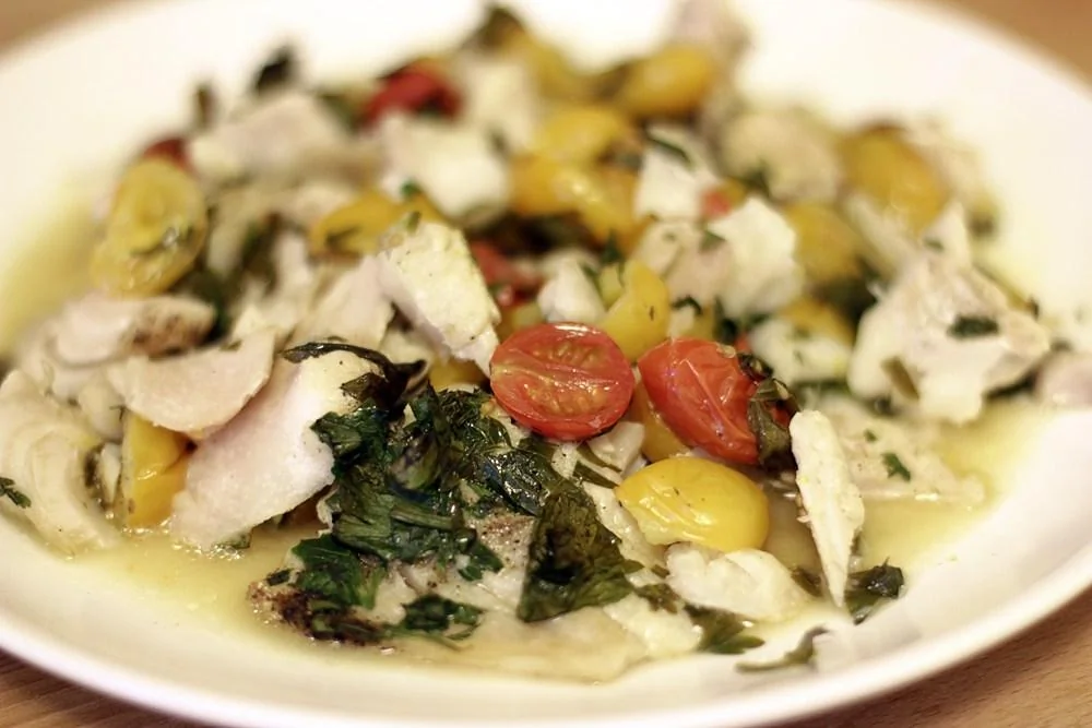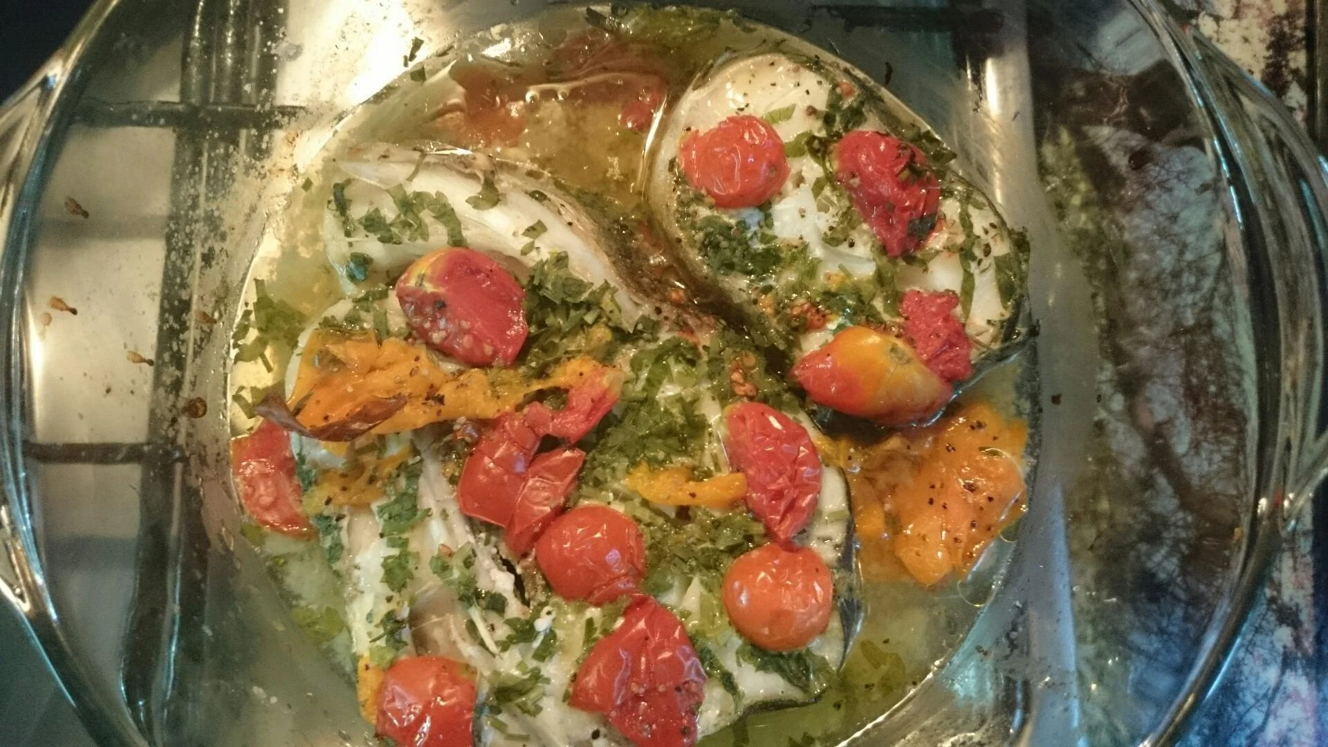 ШАГ 1 В шесть жаропрочных пакетов для жарки в духовке разложить по куску трески, по столовой ложке рубленой петрушки, по четыре помидора, разрезанных пополам, по соку четверти лимона и столовой ложке масла.