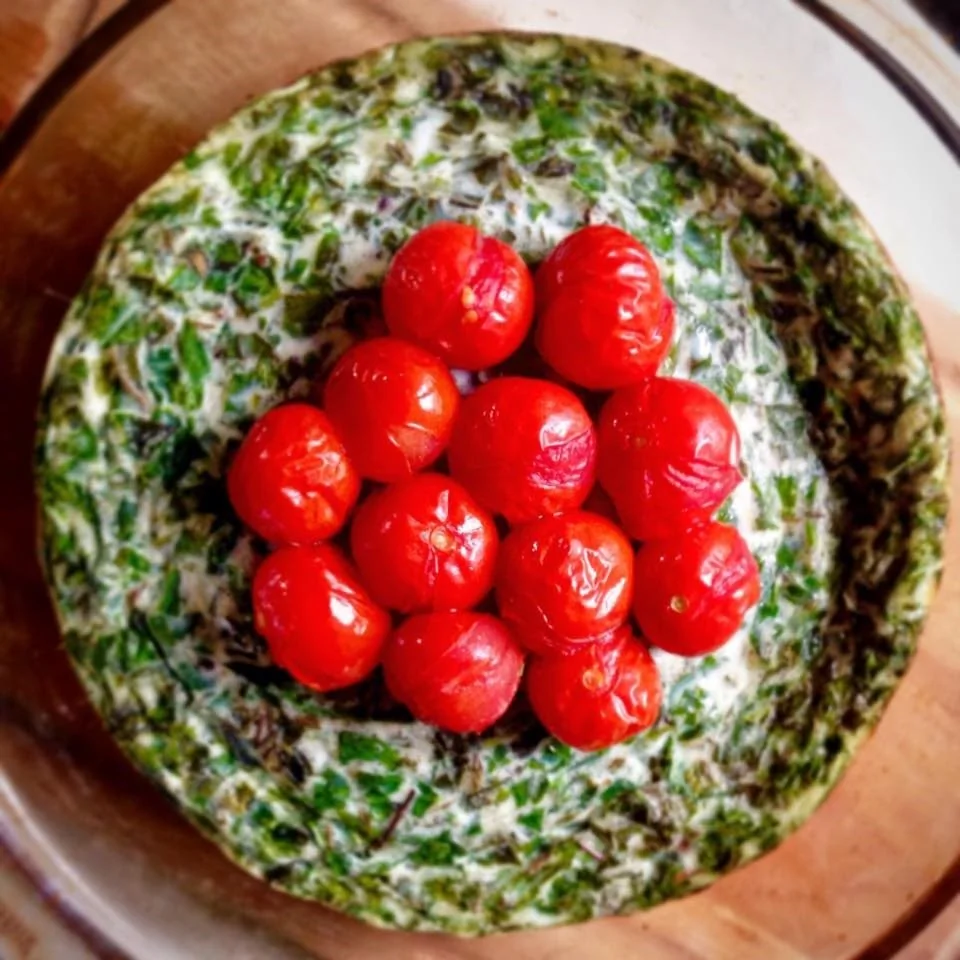 ШАГ 5 Готовый зеленый омлет кюкю украсить печеными помидорами и подавать. Помидоры, кстати, можно вмешать в смесь зелени еще до запекания, но тогда они нарушат цветовую гегемонию кюкю.