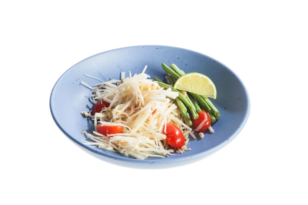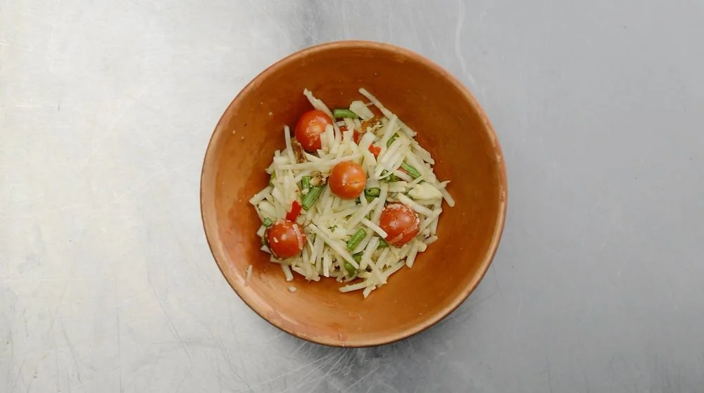 ШАГ 1 Зеленую папайю натереть на терке или нарезать тонкой соломкой. Замочить в холодной воде — папайя станет хрустящей, а лишний крахмал уйдет.
