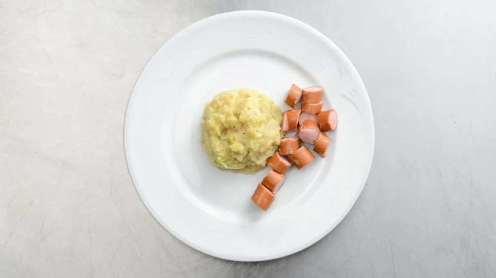 ШАГ 6 Снять кастрюлю с овощами с огня, вынуть сосиски. Добавть бекон с луком, молоко, масло и сделать пюре. Добавить соль и перец по вкусу. Нарезать сосиски и положить поверх пюре.