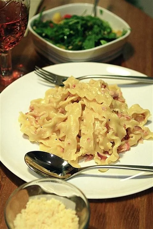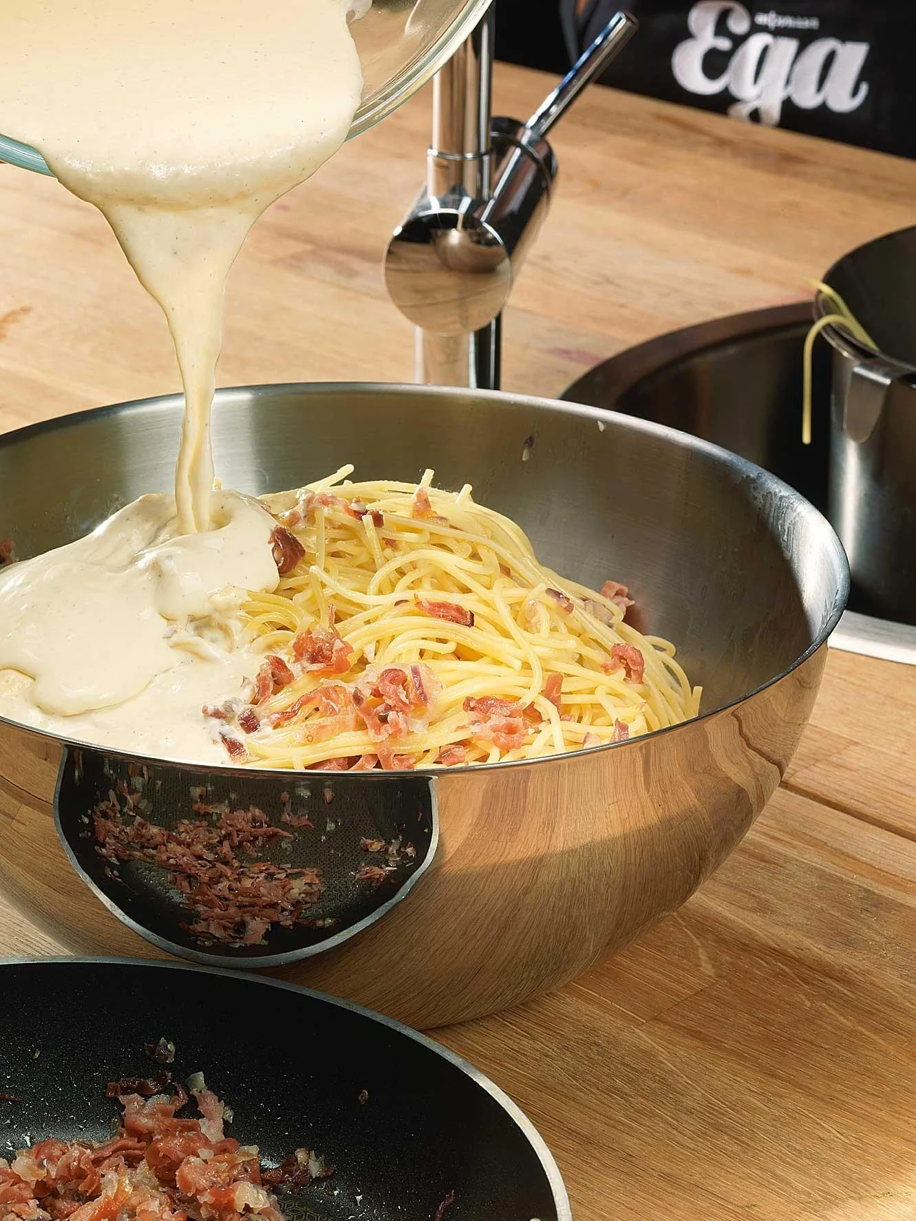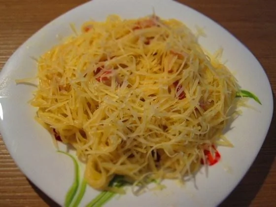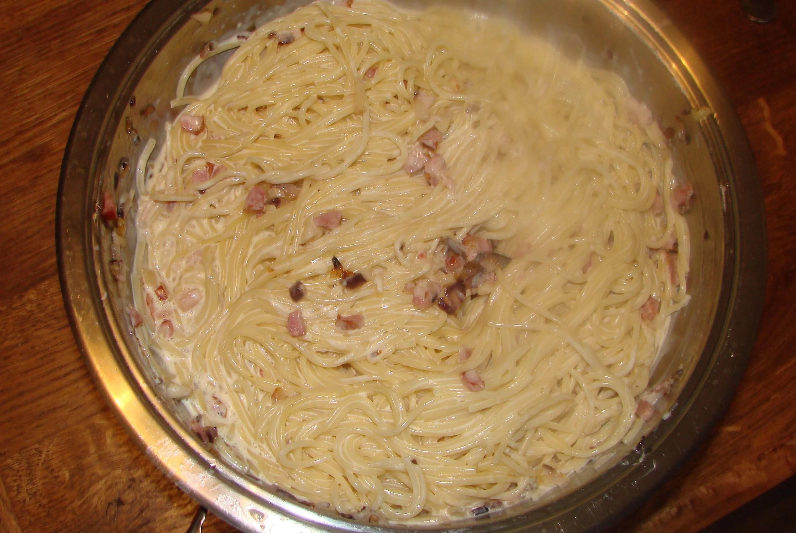 ШАГ 4 В готовые спагетти вывалите обжаренные с луком и чесноком кусочки бекона. Влейте смесь сливок, желтков и пармезана, перемешайте. И сразу подавайте, посыпав свеженатертым сыром и черным молотым перцем.