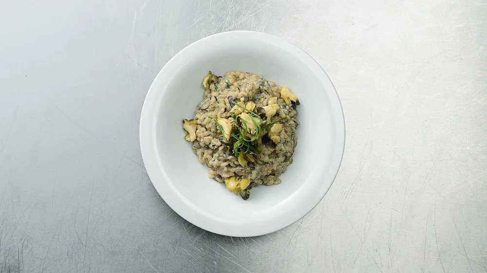 ШАГ 5 Начать по одному половнику подливать грибной бульон, как в ризотто. Следующую порцию жидкости добавлять, когда предыдущая уже впиталась. Таким образом довести перлотто до готовности (около 25 минут). По вкусу приправить солью и перцем.