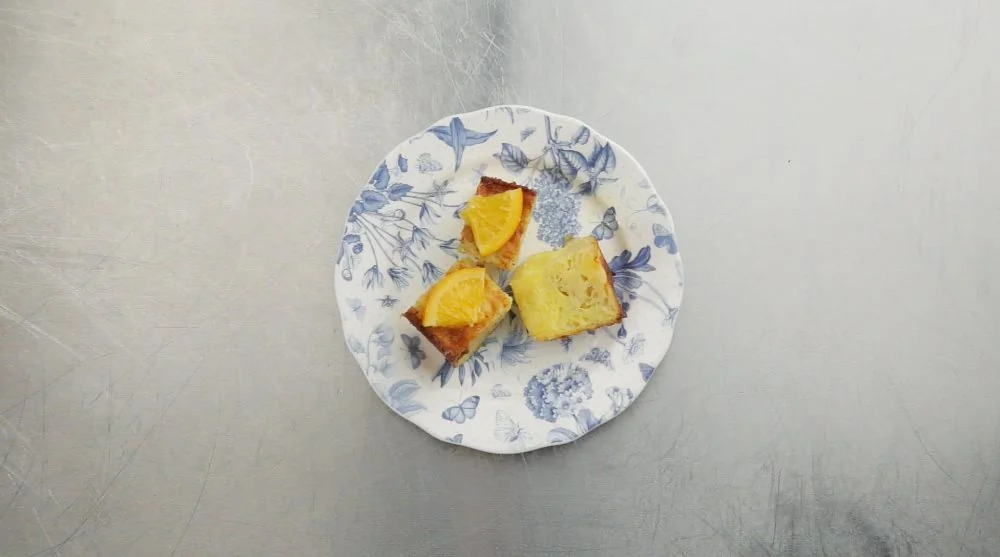 ШАГ 5 Выпекать 35-40 минут до красивого золотистого цвета. Когда кекс готов, проткнуть его несколько раз шпажкой и полить остывшим сиропом. Так пирог пропитается особенно хорошо. Для подачи пирог стоит разрезать на 12 квадратных ломтиков и каждый из них украсить четвертью апельсина.