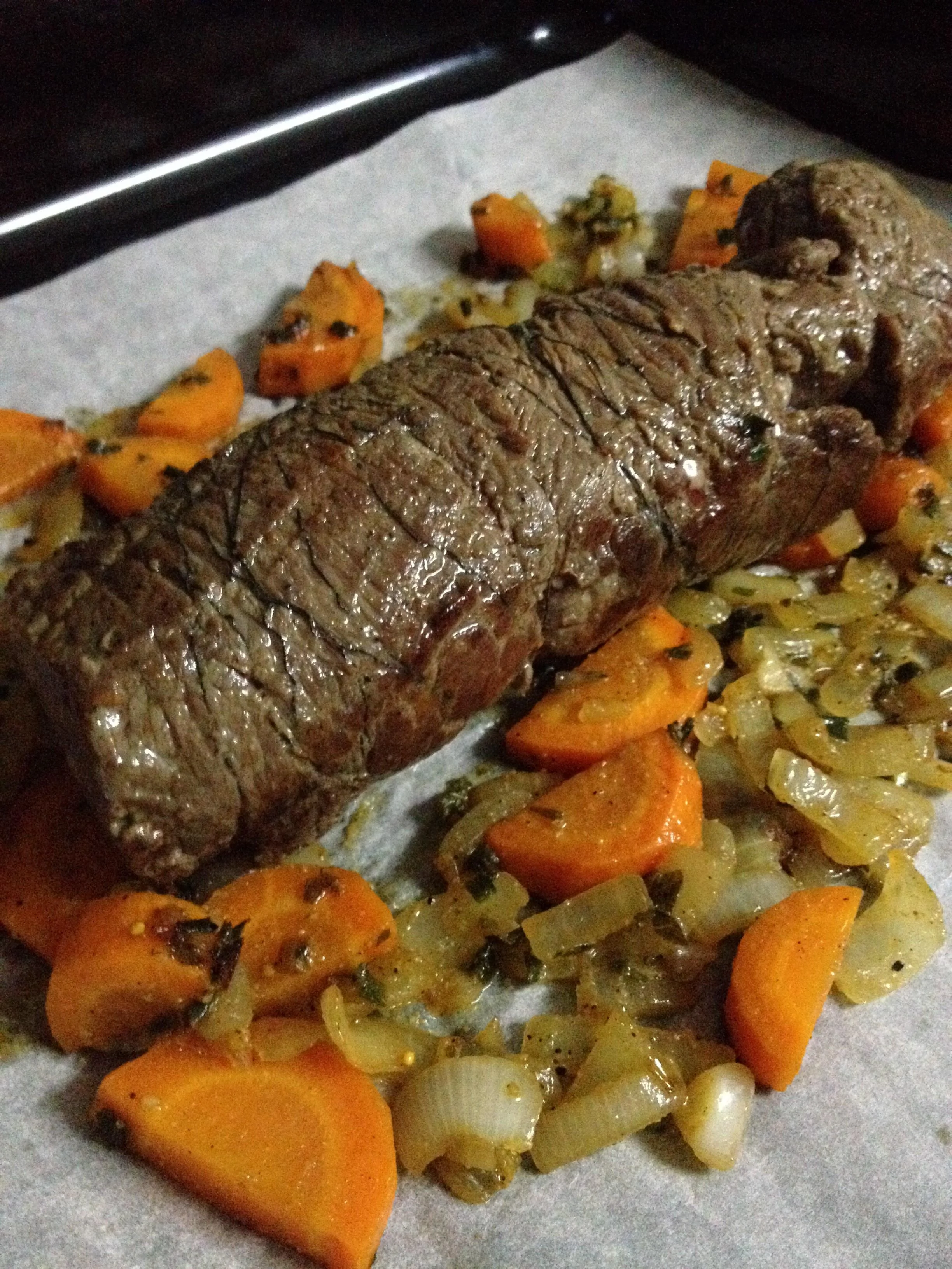 ШАГ 3 Говядину вместе с овощами и букетом гарни положить на противень и запекать шестьдесят-семьдесят минут при температуре 200 градусов.