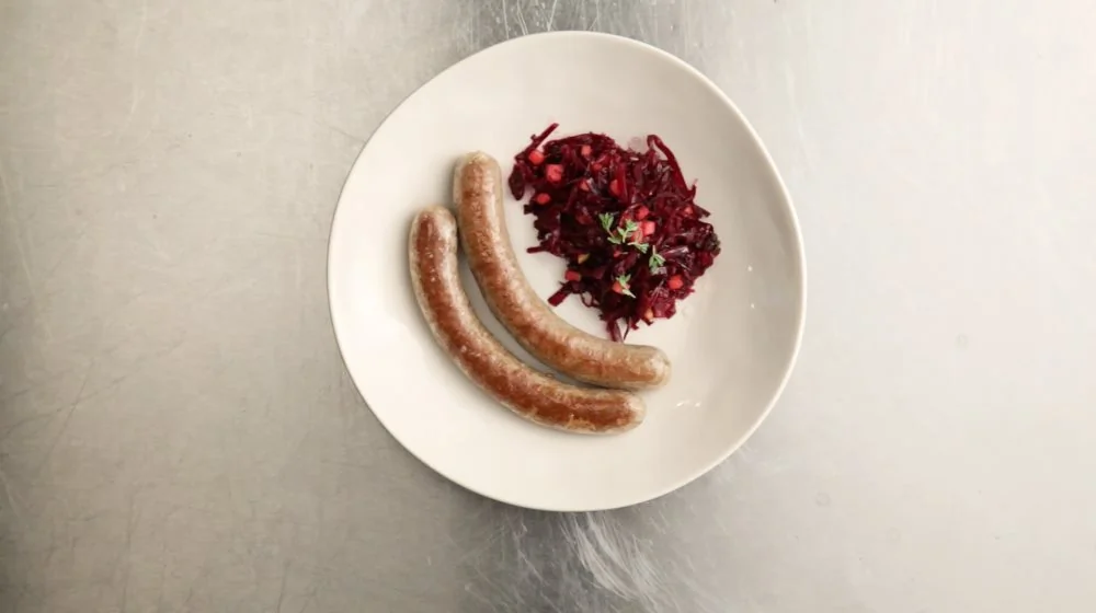 ШАГ 4 В самом конце добавить несколько листиков тимьяна, нарезанное кубиком яблоко и нарезанный мелко лук сибулет. Подавать с жаренными колбасками.