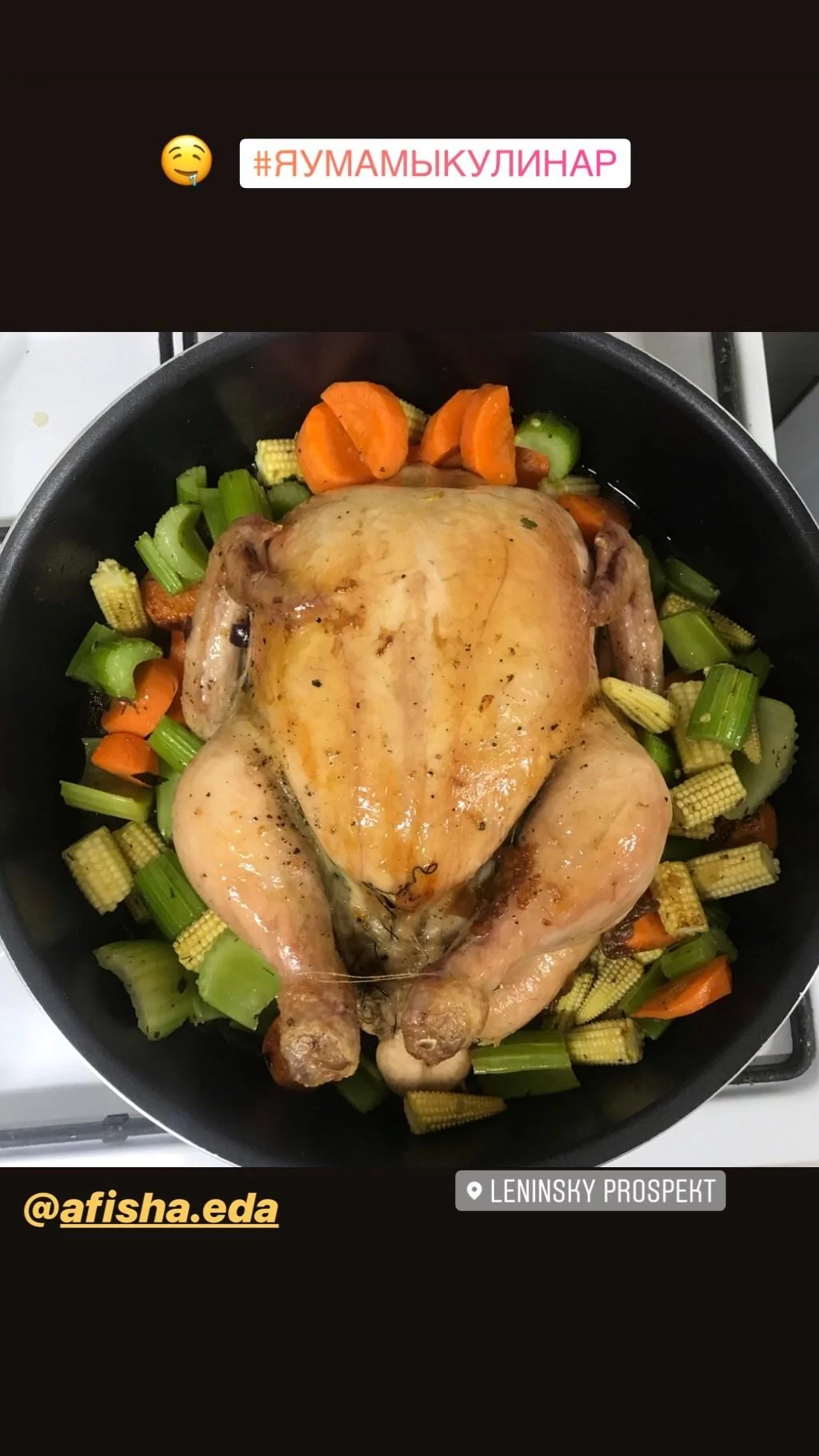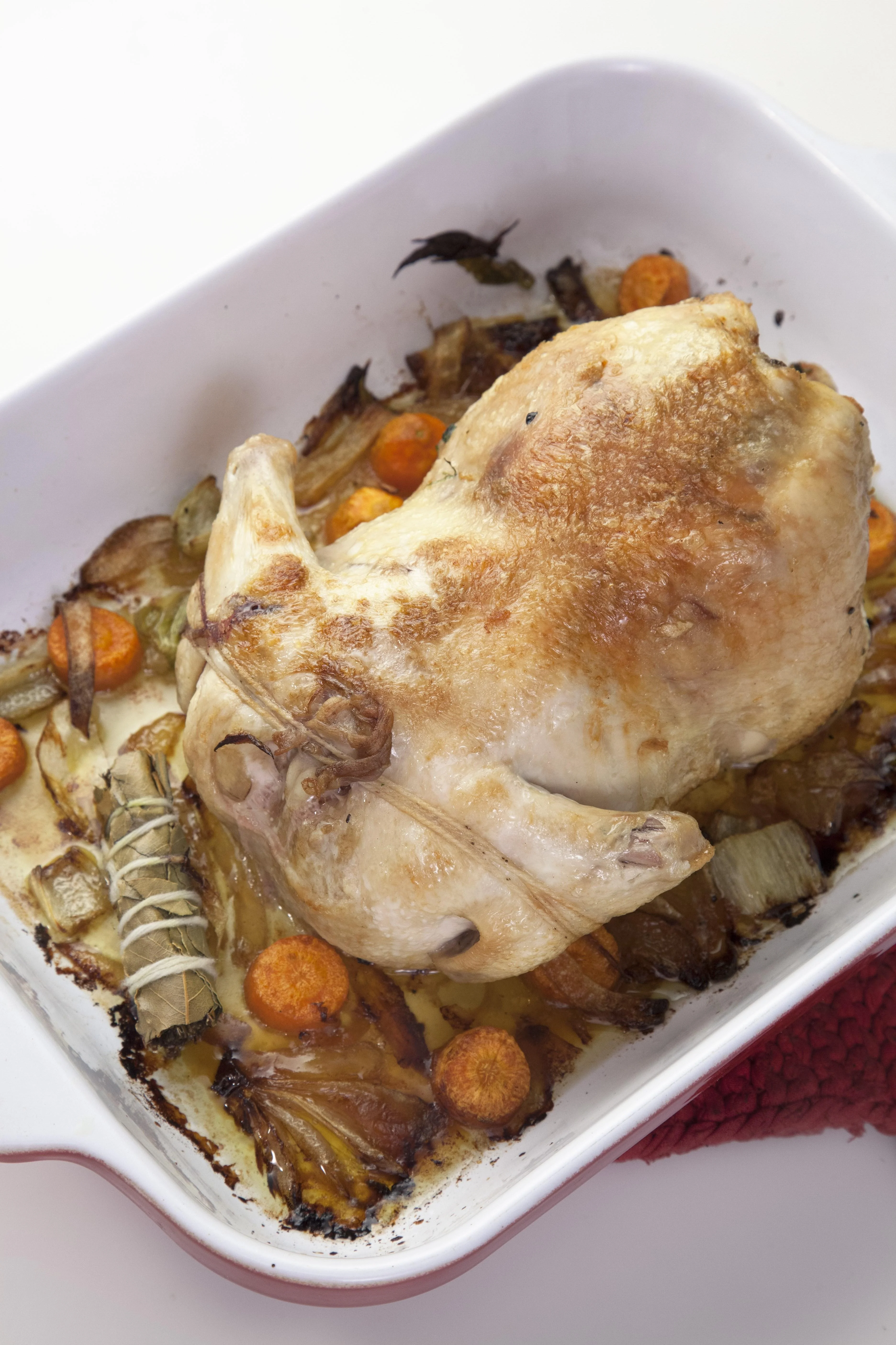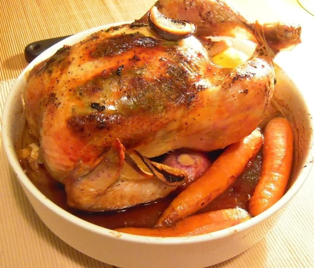 ШАГ 5 Положить курицу на противень, а на сковороде на масле из под нее обжарить крупно нарезанный лук, морковь и сельдерей. Переложить овощи на тот же противень, добавить букет гарни и отправить в духовку (180 градусов) на пятьдесят минут.