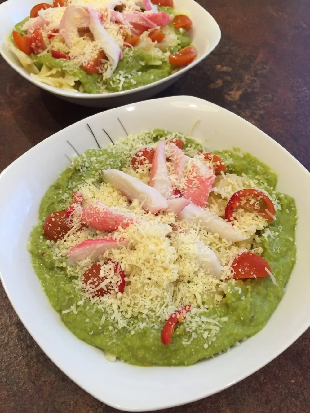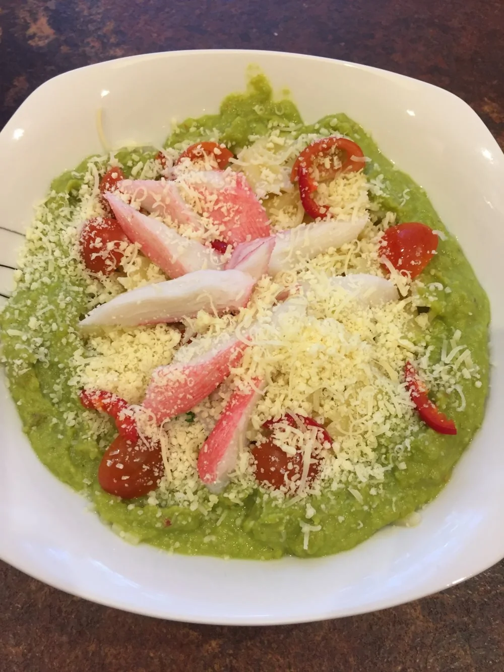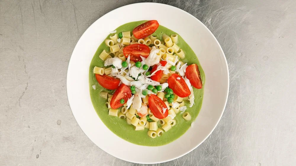 ШАГ 4 Затем в сковороде разогреть 20 грамм оливкового масла и в течение минуты прогреть оставшийся горошек, добавить пасту и быстро перемешать. В глубокую тарелку влить соус из горошка, выложить в него пасту, украсить крабом, половинками помидоров черри и тертым пармезаном. Сбрызнуть оставшимся оливковым маслом и при желании украсить мелко нарезанным перцем чили.