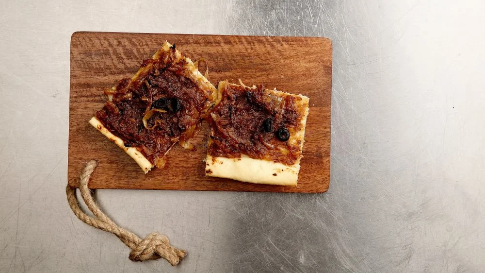 ШАГ 3 Разогреть духовку до 200 С. Снять пленку с теста, и раскатать на рабочей поверхности, присыпанной мукой. Застелить противень пергаментной бумагой и переложить на него тесто. Ровным слоем выложить на тесто луковую начинку. Оливки разрезать пополам и выложить поверх начинки. Неплотно накрыть тарт пленкой, дать постоять еще 1 час, чтобы расстоялось тесто. Выпекать 20 минут, пока тесто не станет золотистым. Дать постоять 10 минут, прежде чем разрезать на квадраты и подавать.